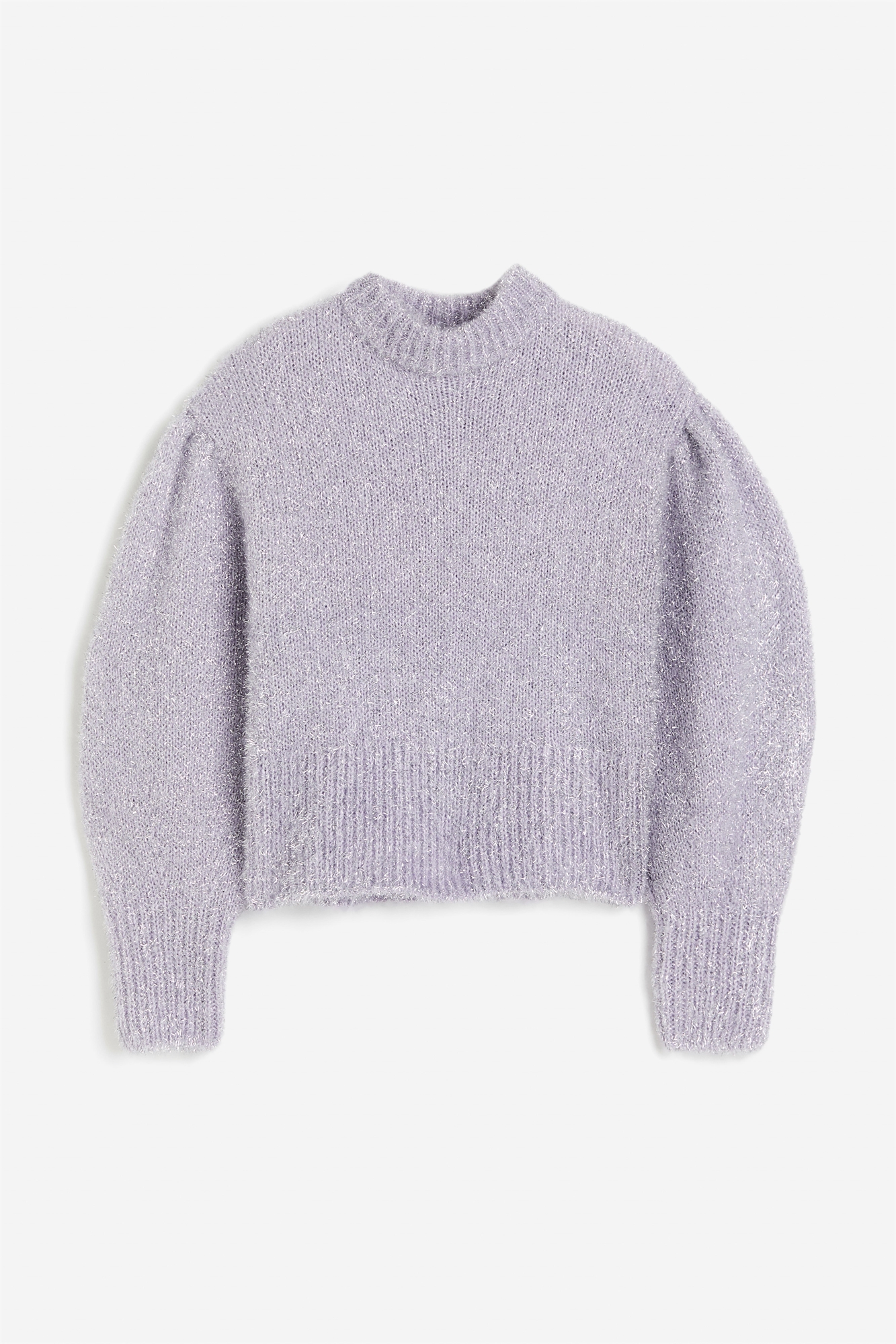 Короткий джемпер свободного кроя из мягкого трикотажа с круглым вырезом, спущенными плечами и длинными рукавами-баллончиками со складками в верхней части. Окантовка по вырезу горловины, манжетам и подолу.