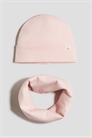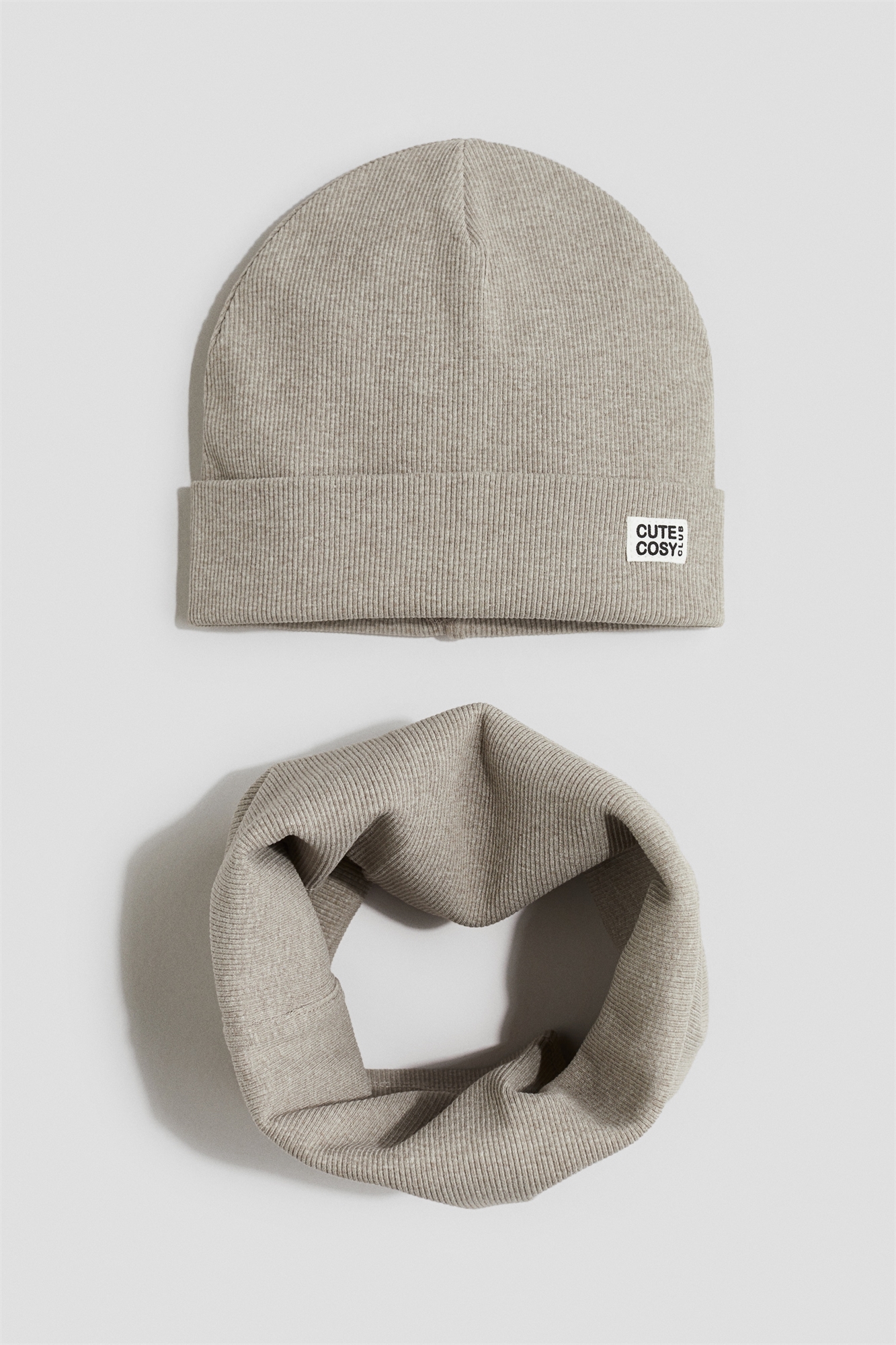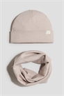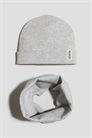 Комплект из бини и шарфа-трубы из мягкого ребристого трикотажа. Пинетки с небольшой тканевой аппликацией на отворачивающемся подоле.