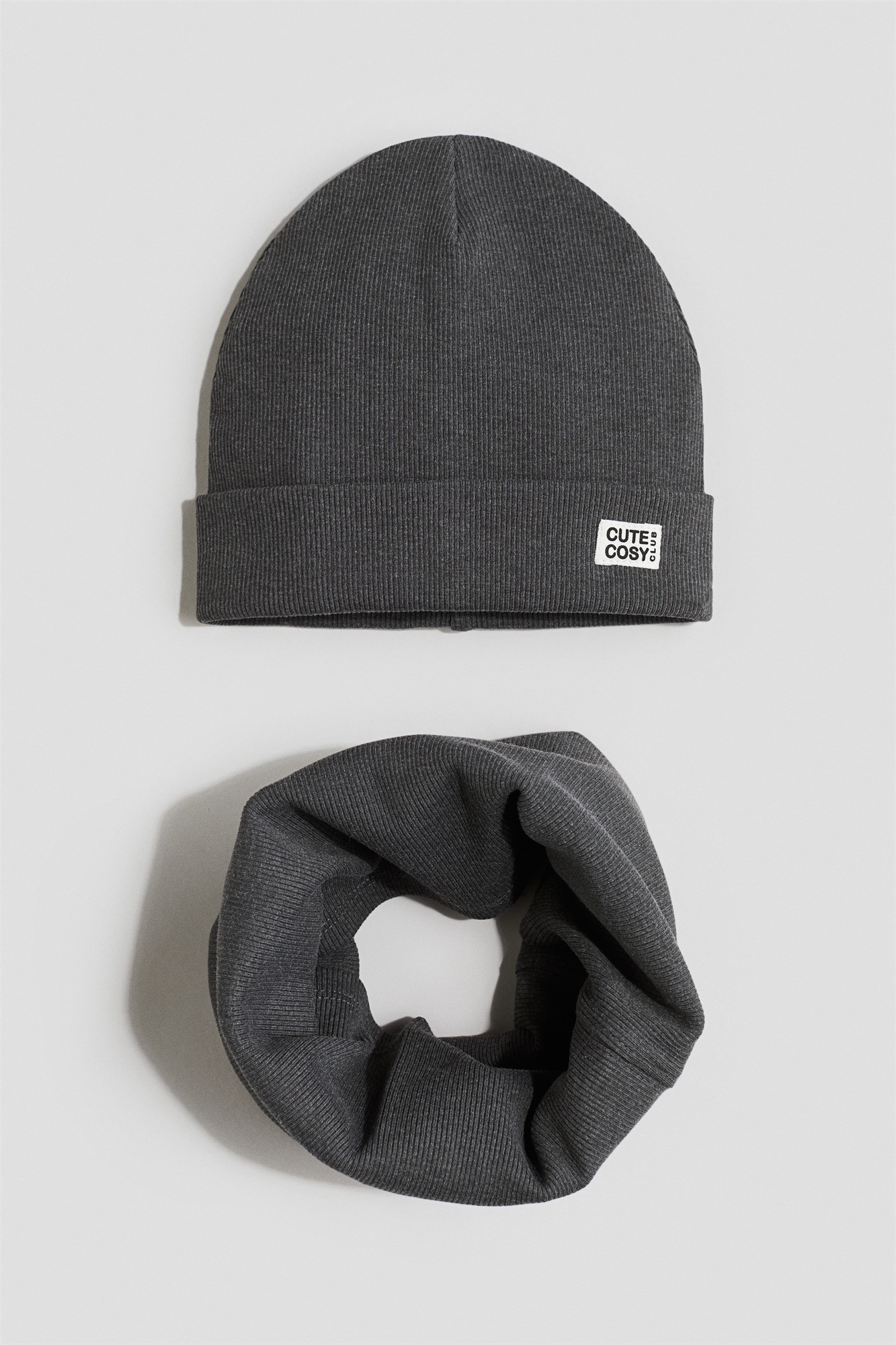 Комплект из бини и шарфа-трубы из мягкого ребристого трикотажа. Пинетки с небольшой тканевой аппликацией на отворачивающемся подоле.