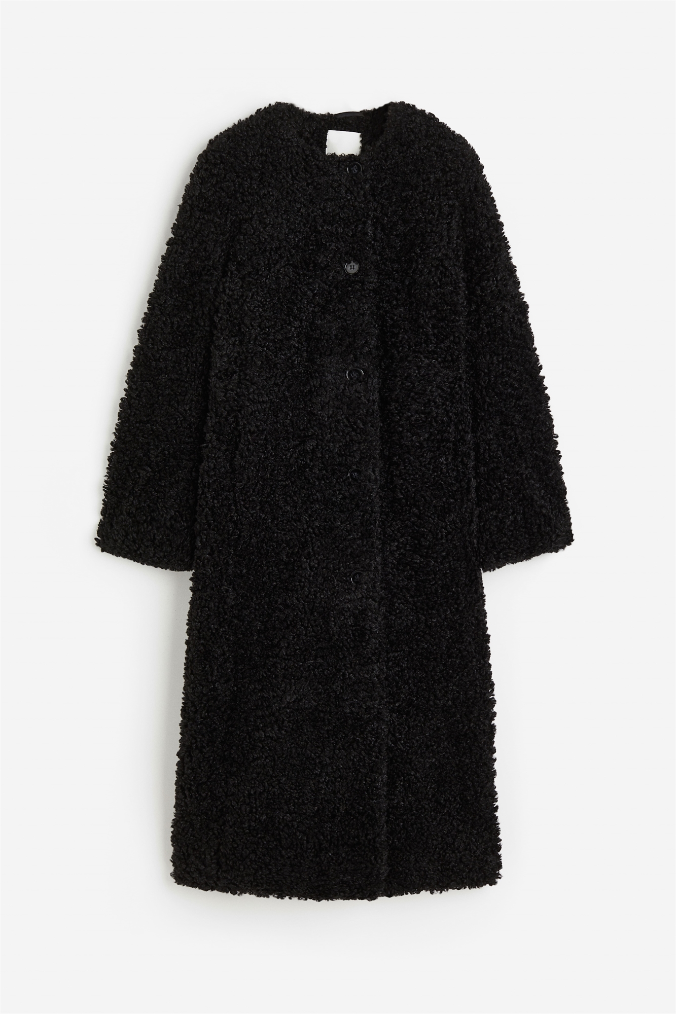 Пальто длиной до щиколоток из мягкого тедди с круглым вырезом, пуговицами спереди и незаметными карманами в боковых швах. На подкладке.