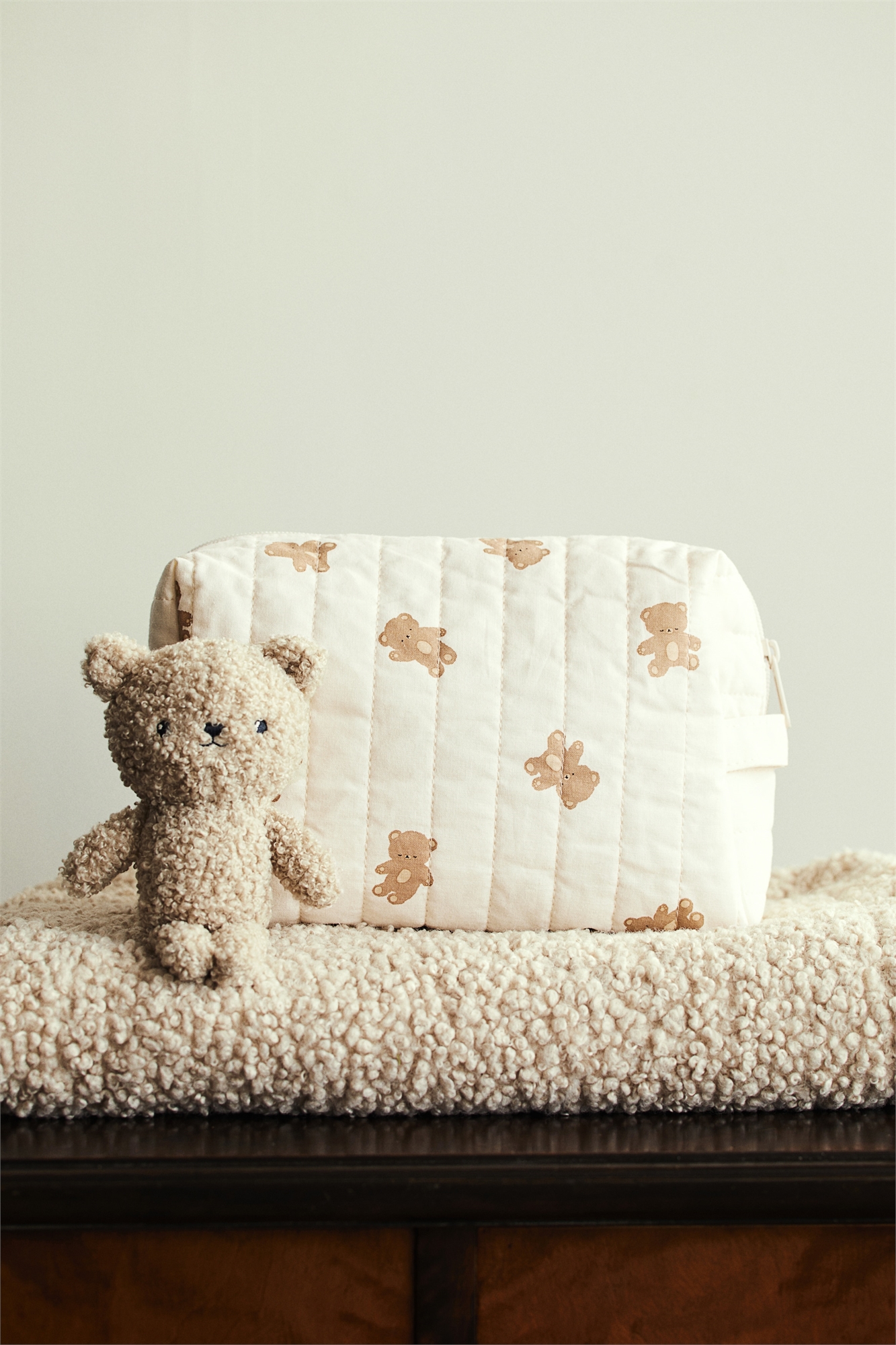 Сумка для пеленания из хлопчатобумажной ткани с легкой набивкой и набивным рисунком в виде сердца. Два внутренних отделения, чтобы вы могли легко найти то, что вам нужно во время пеленания. Застежка-молния сверху и ручка с одной короткой стороны. Глубина 10 см. Высота 15 см. Длина 24 см.