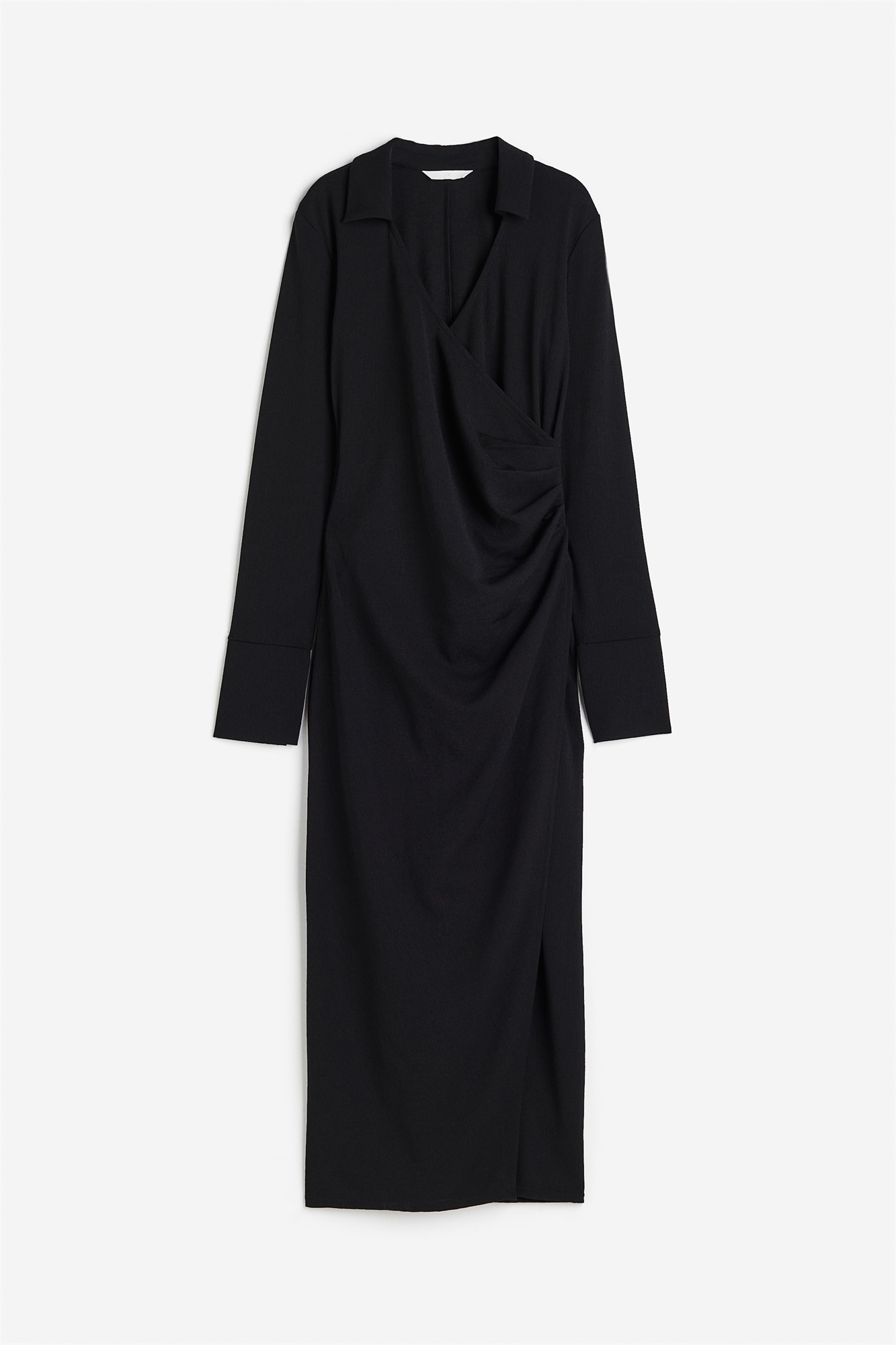 Приталенное платье длиной до колен из фактурного джерси с воротником и V-образной проймой спереди. Спереди пришита накидка со складками с одной стороны для легкой драпировки. Длинные рукава и широкие двухслойные манжеты с разрезом.