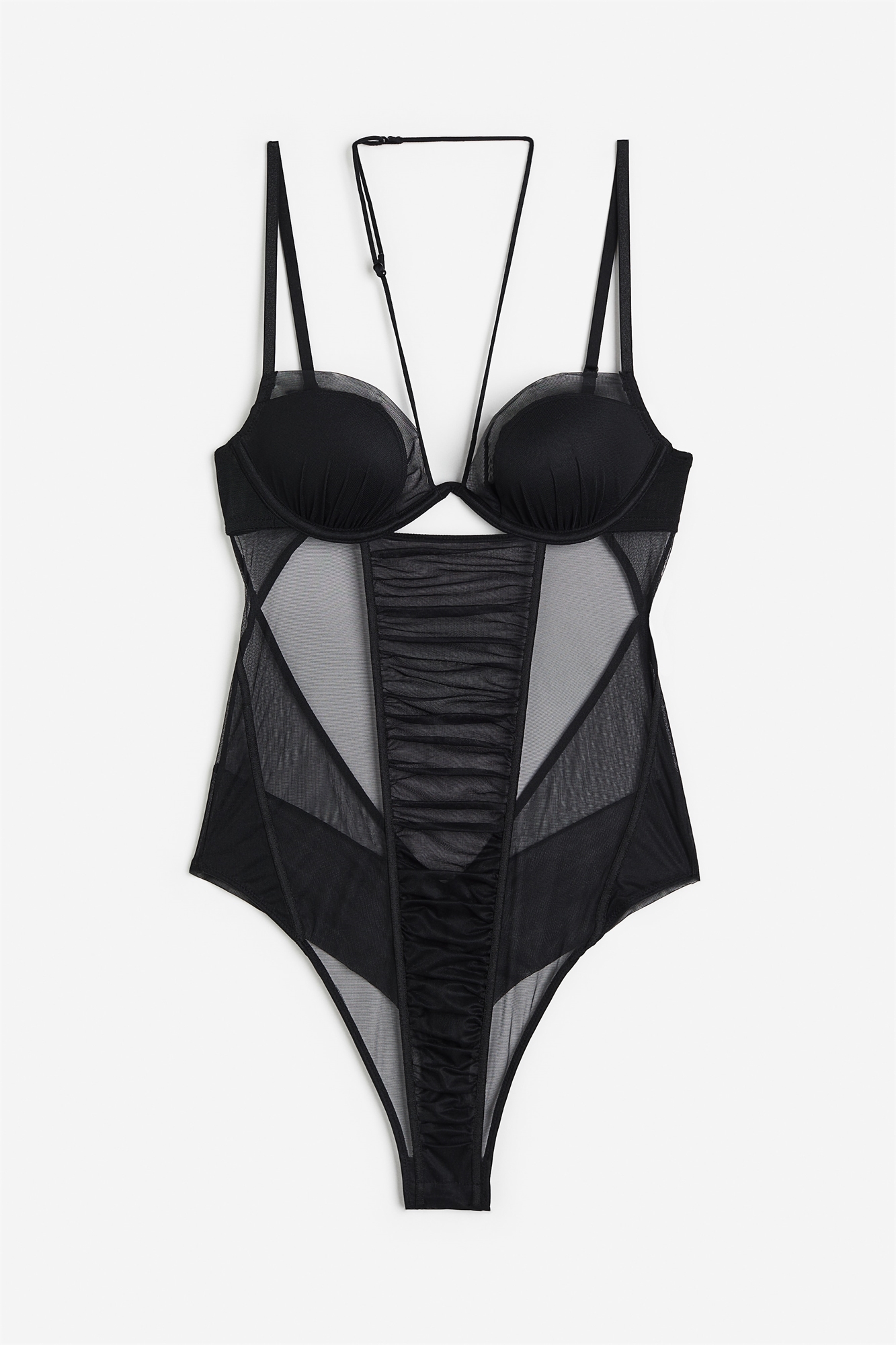Боди из сетки с регулируемыми плечевыми лямками и узкой регулируемой бретелью на шее. Спереди рюши, чашечки с мягкой подкладкой, придающие форму бюсту и обеспечивающие хорошую поддержку, открытая спина с застежкой на крючки и глазки. Ластовица на подкладке с потайными кнопками и высоким разрезом сзади.