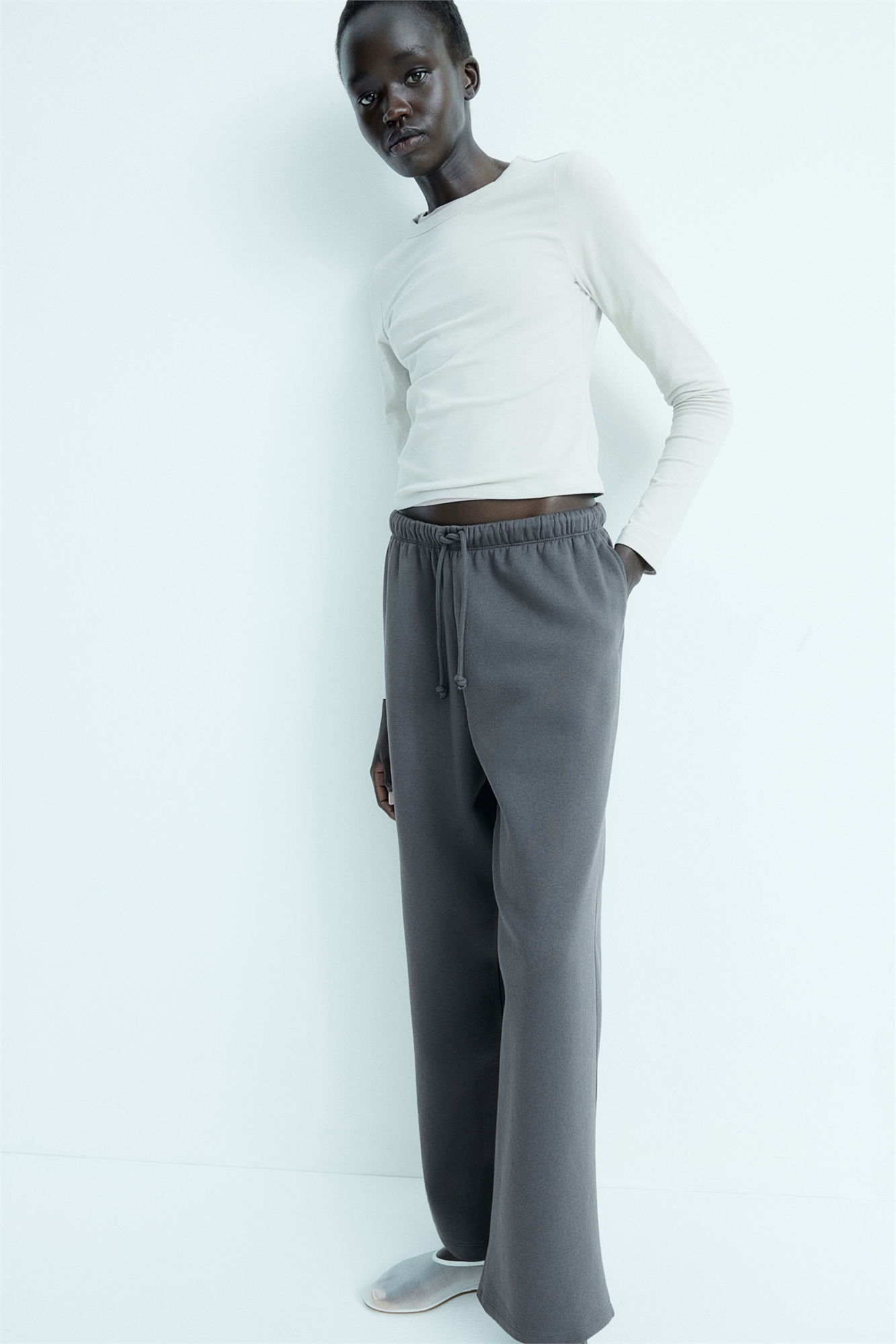 Джоггеры свободного кроя из толстоватой ткани с эластичным поясом, мягким начесом внутри, незаметными карманами в боковых швах и широкими штанинами.