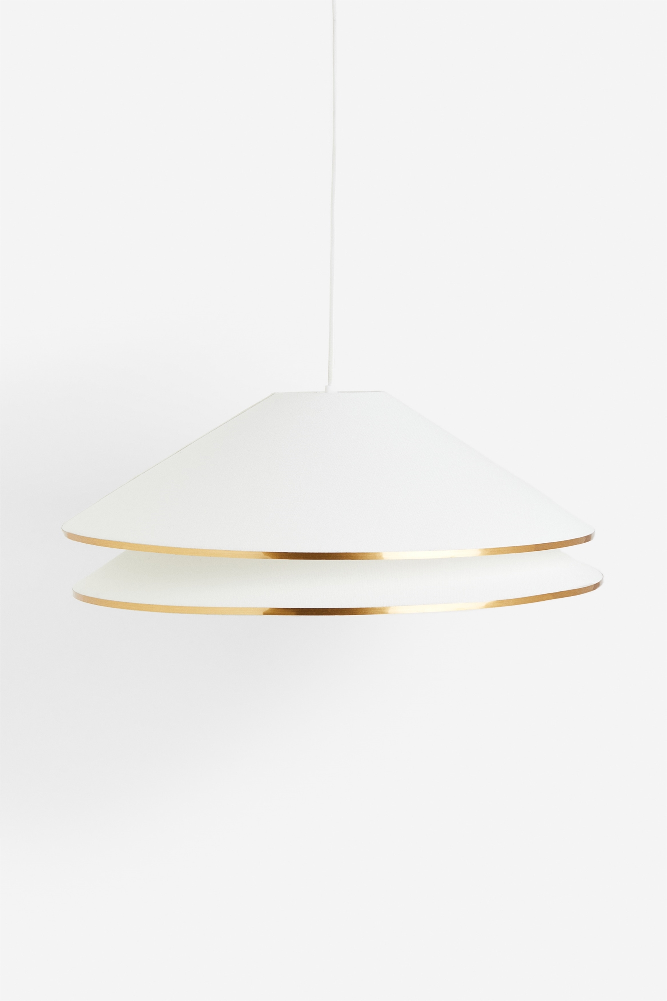 Подвесной светильник с абажуром из двух наклонных дисков с тканевой обивкой и ободками золотого цвета, которые рассеивают свет и создают теплую и уютную атмосферу. Шнур с тканевой отделкой. Патрон E27. Максимальная мощность 15 Вт. Лампочка в комплект не входит. Высота 18 см. Диаметр абажура 50 см.