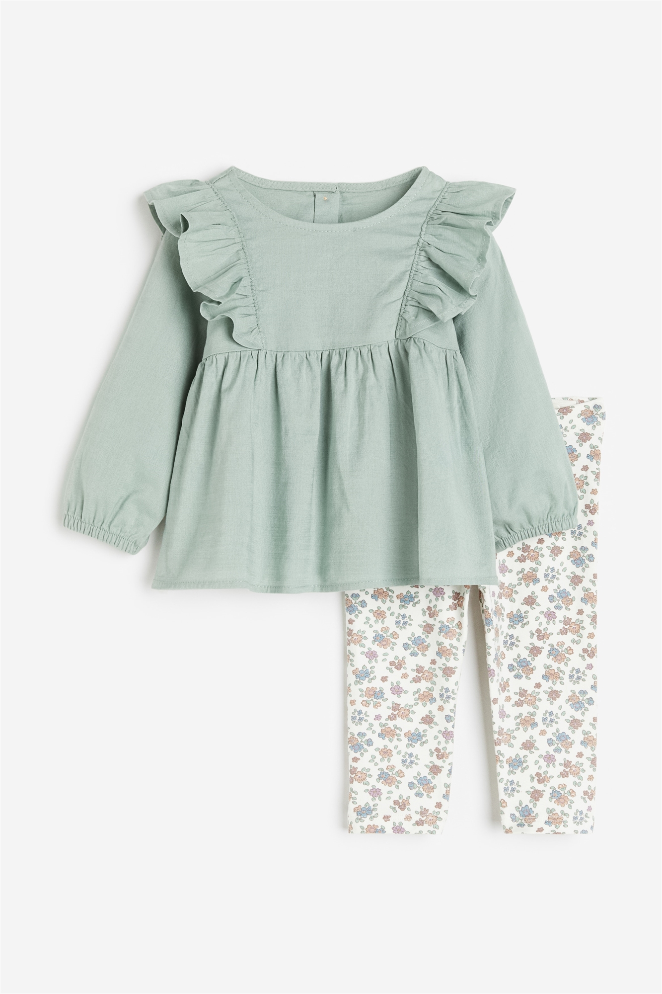 Комплект из блузки из мягкого тканого материала с воланами и леггинсов из удивительно мягкого хлопкового джерси. Блузка с длинными рукавами, круглым вырезом, пуговицами сзади и эластичными манжетами. Леггинсы с мягким, регулируемым эластичным поясом для комфортной посадки.