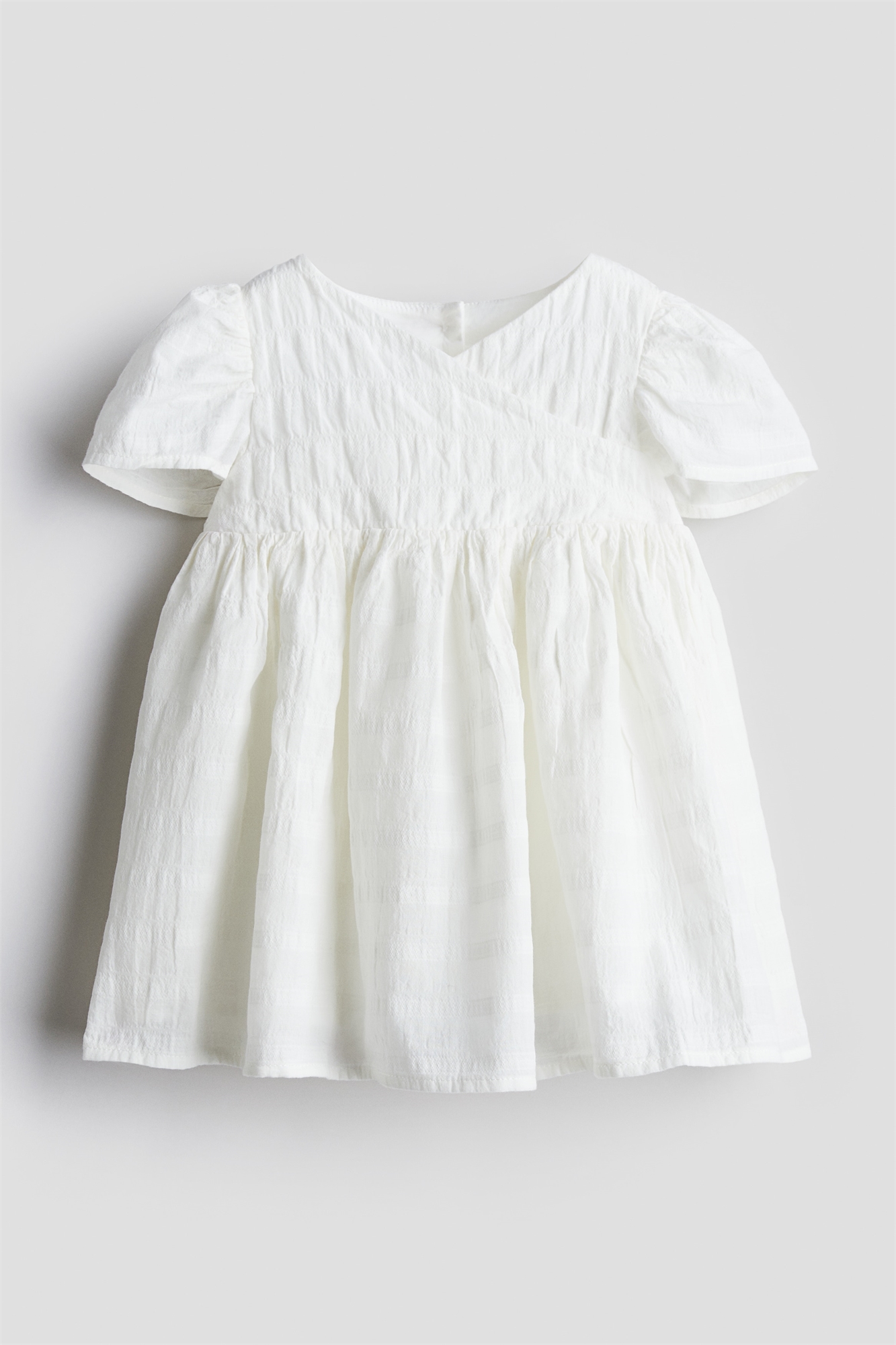 Платье с короткими рукавами из хлопчатобумажного полотна с облегающим лифом. V-образный вырез, пуговицы сзади и сборчатый шов на талии придают платью объем. На подкладке.
