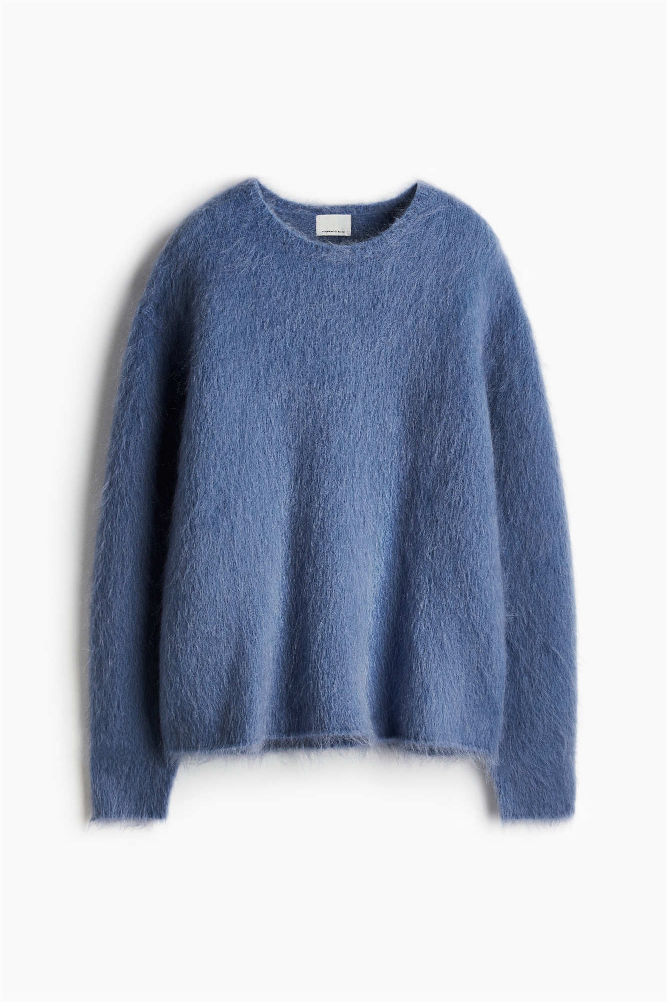 Джемпер из мягкого, пушистого трикотажа с содержанием мохера и шерсти. Свободный крой с круглым вырезом, спущенными плечами и объемными, очень длинными рукавами, сужающимися к манжетам.