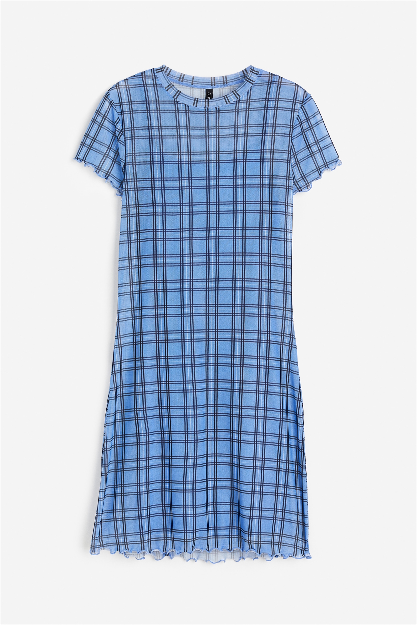 Короткое приталенное платье из прозрачной сетки. Круглый вырез с узкой окантовкой, короткие рукава и оверлочные края на манжетах и подоле. На подкладке с коротким нижним платьем из джерси с узкими бретелями.
