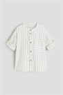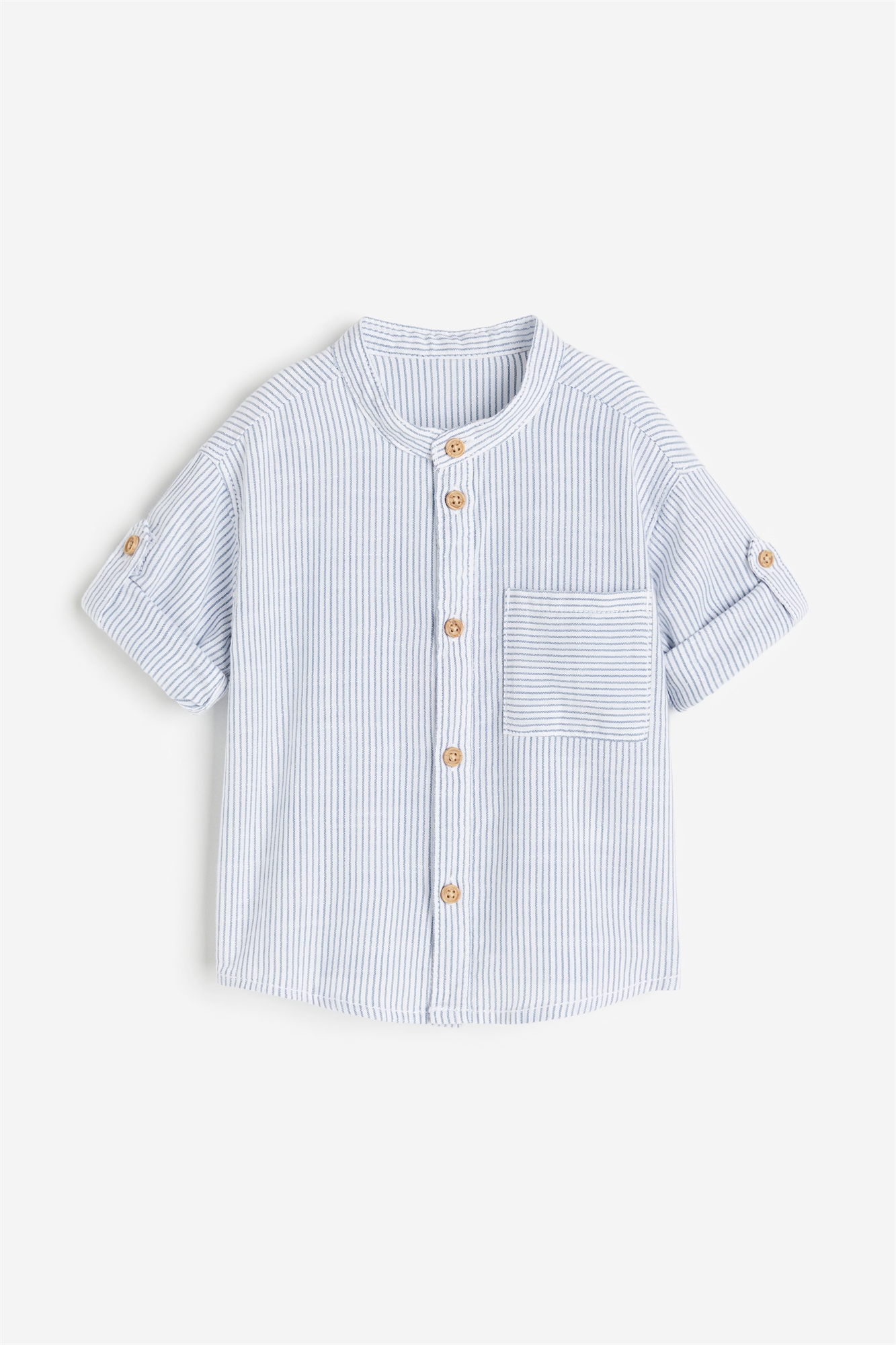 Рубашка из мягкого хлопкового полотна с воротником "дедушка", передним карманом и пуговицами в виде дерева спереди. Рукава длиной 3/4 с завязкой и пуговицей.