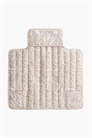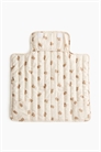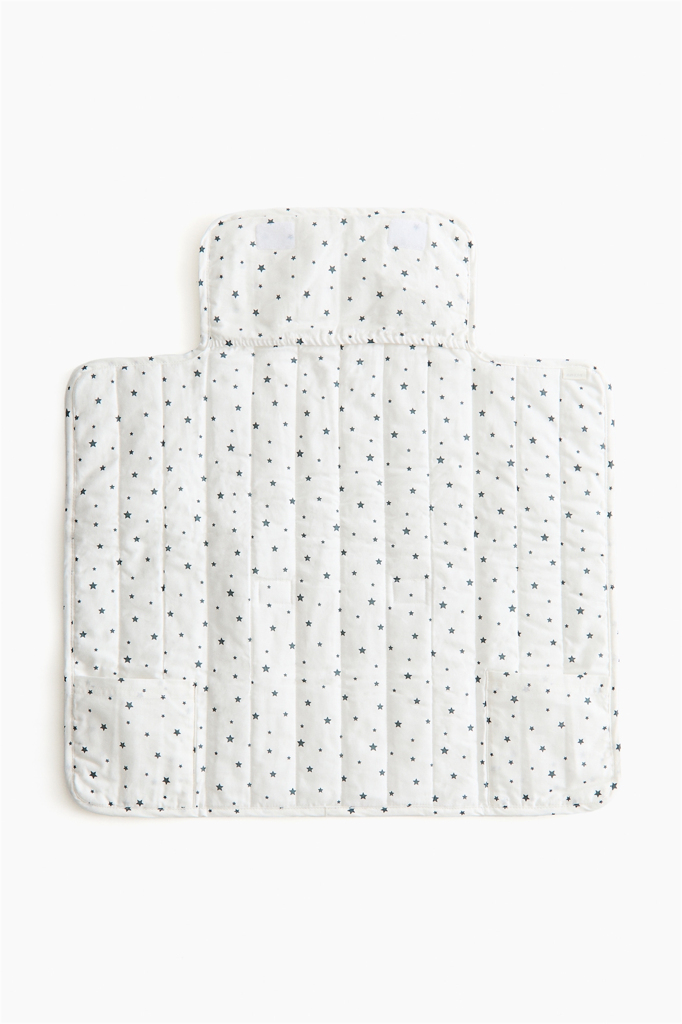 Пеленальный коврик с мягкой подкладкой из стеганого хлопкового полотна с принтом на всю поверхность. Коврик складывается и обеспечивает удобное пространство для смены подгузников на ходу. Три кармана для предметов первой необходимости, один из них с эластичным отверстием. Застежка на крючок и петлю сзади. Размер в сложенном виде 16x30 см.