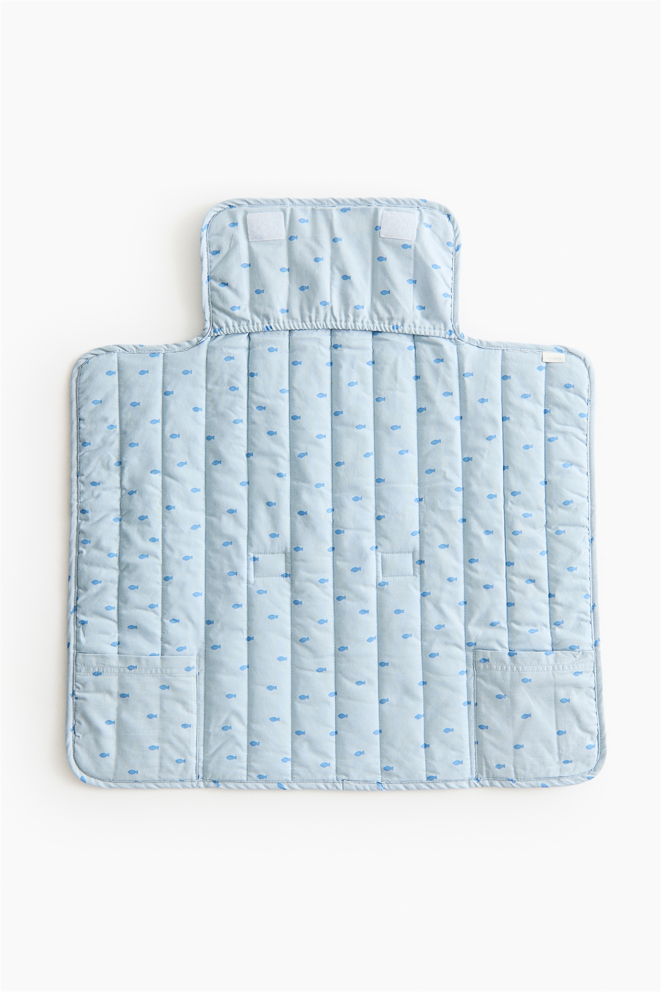 Пеленальный коврик с мягкой подкладкой из стеганого хлопкового полотна с принтом на всю поверхность. Коврик складывается и обеспечивает удобное пространство для смены подгузников на ходу. Три кармана для предметов первой необходимости, один из них с эластичным отверстием. Застежка на крючок и петлю сзади. Размер в сложенном виде 16x30 см.