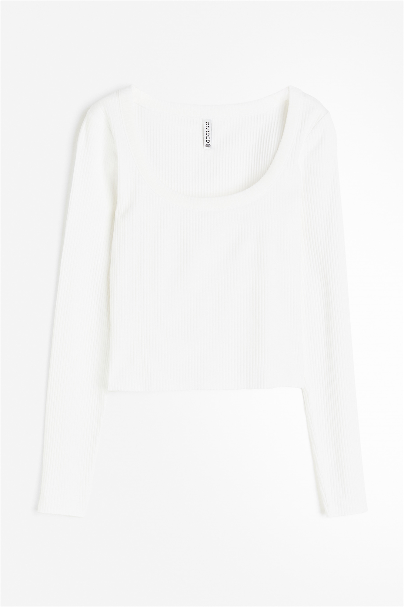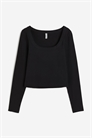 Короткий приталенный топ из ребристого хлопкового джерси с квадратным вырезом, длинными рукавами и необработанными краями на манжетах и подоле.