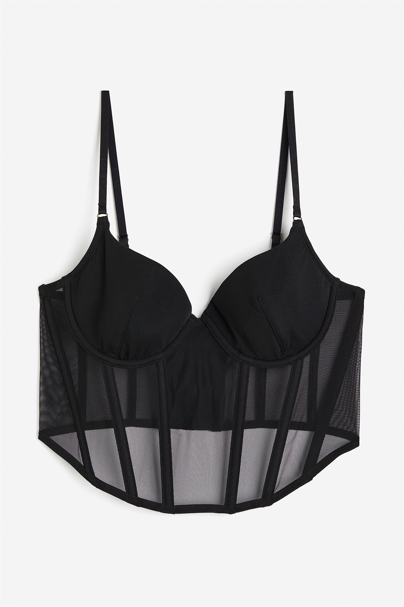 Бюстье с мягкими чашечками с заниженной талией, придающими форму бюсту и обеспечивающими хорошую поддержку. Регулируемые бретели, косточки спереди для придания формы и поддержки, широкая застежка на крючки и глазки сзади.