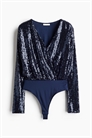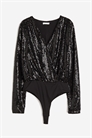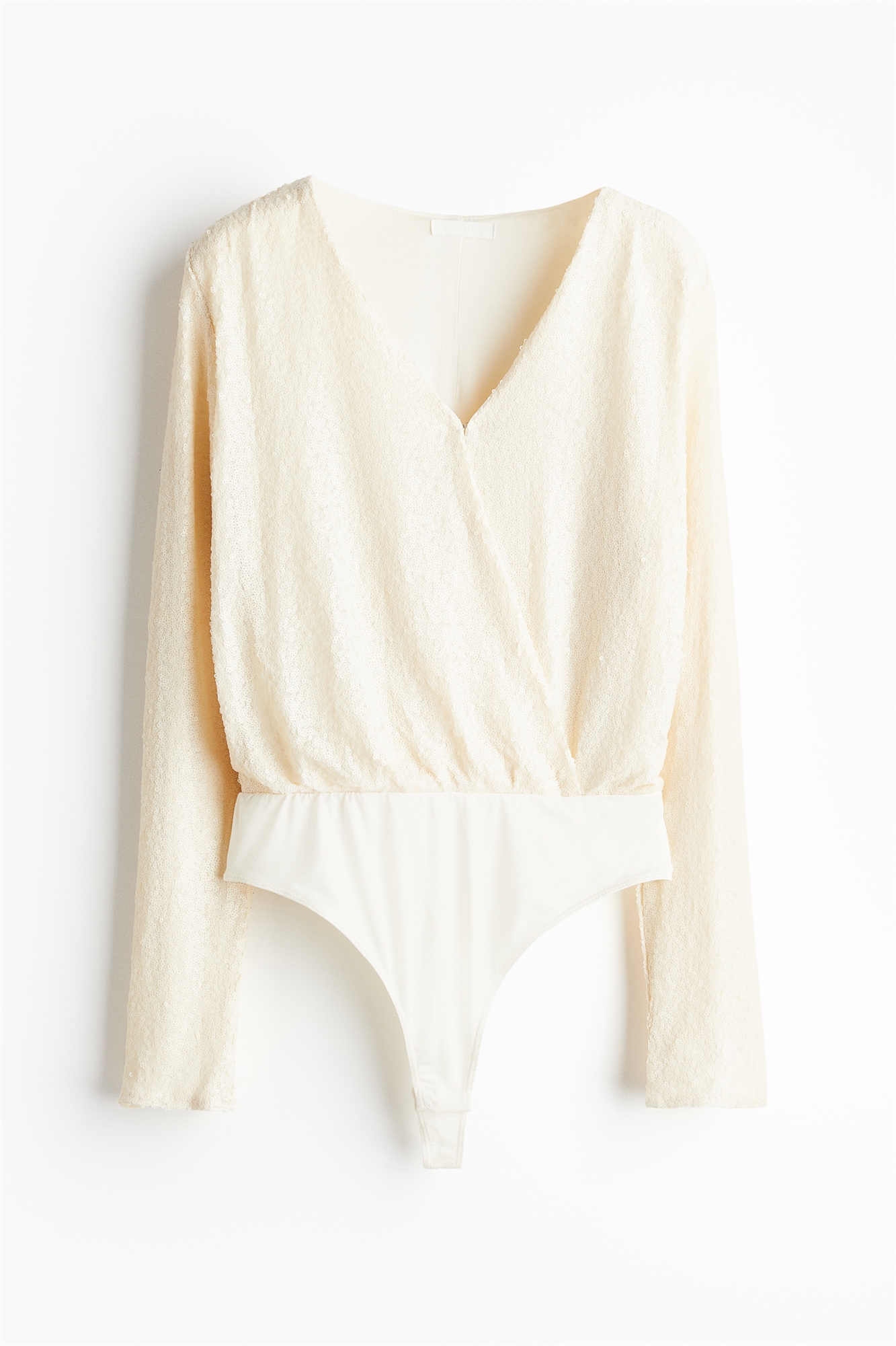Боди с длинными рукавами из сетки с блестками, с пришитой обтяжкой спереди и глубоким V-образным вырезом с потайной застежкой на крючки и глазки. Скрытые кнопки в промежности и вырез сзади. Подкладка из джерси.