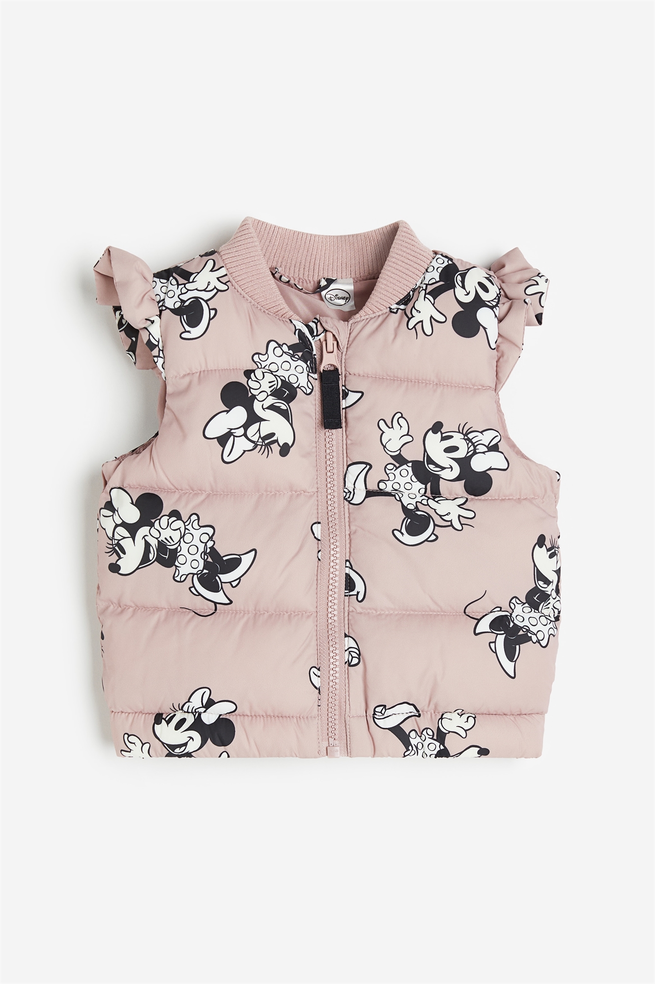 Мягкая жилетка из стеганой ткани с принтом на всю поверхность. Небольшой ребристый воротник-стойка, застежка-молния спереди, защита подбородка от натирания и легкая отделка оборками на плечах. Эластичная резинка по подолу. На подкладке.