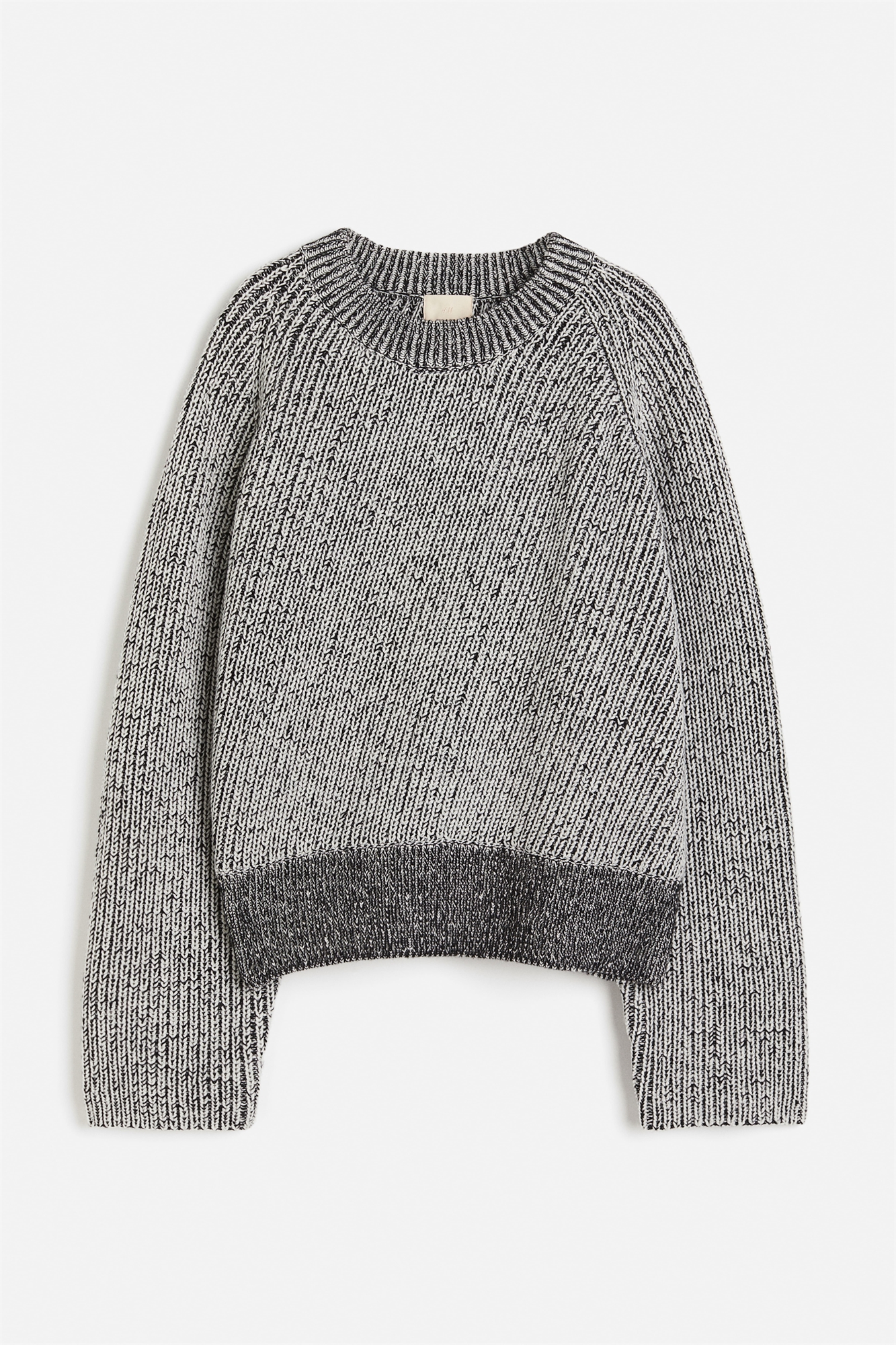 Джемпер свободного покроя из мягкого трикотажа, выполненного из смеси шерсти. Круглый вырез с ребристой отделкой, длинные рукава реглан и широкая тесьма по подолу.