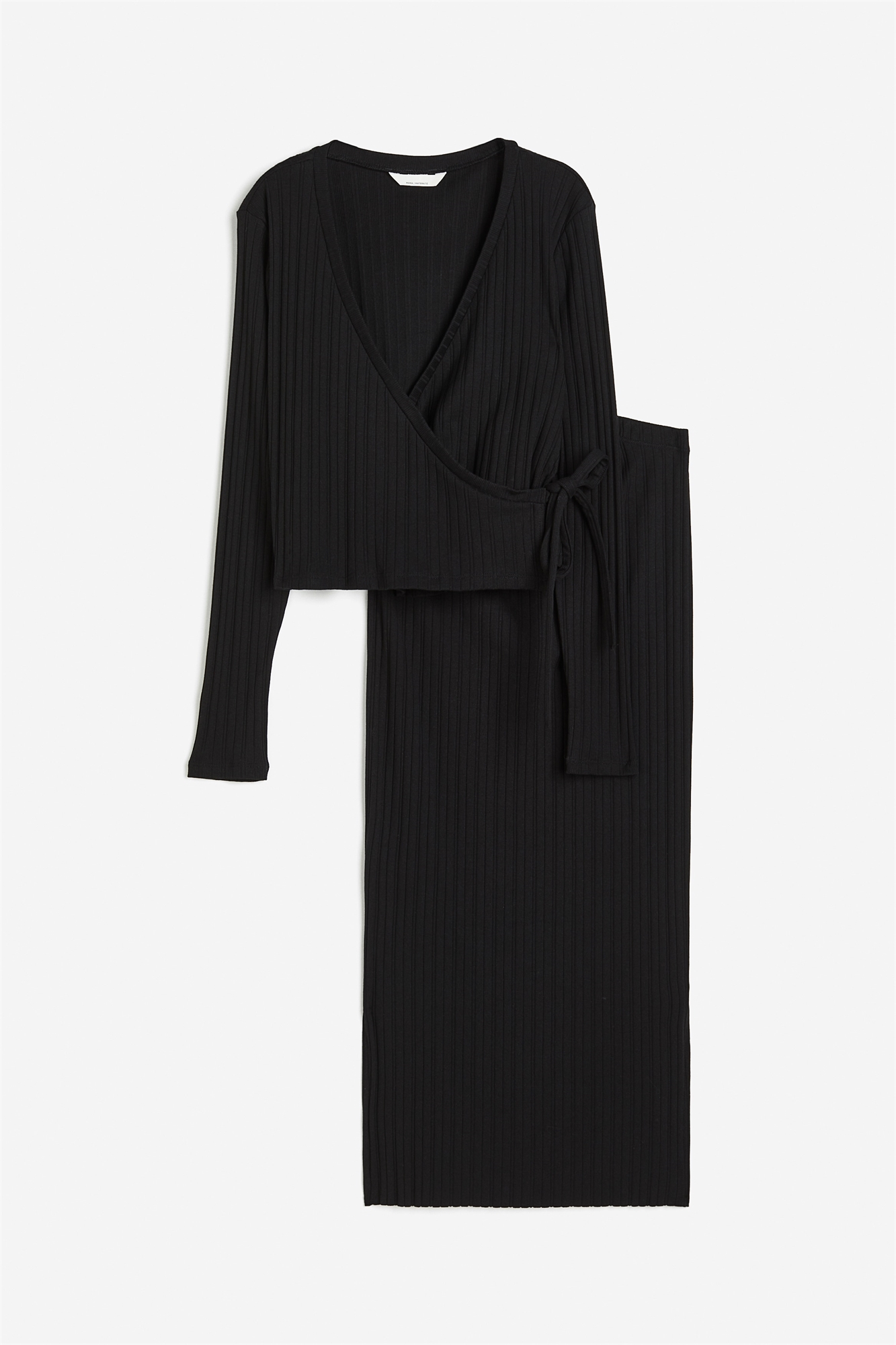Комплект с рубашкой и юбкой из мягкого ребристого хлопкового джерси. Рубашка с V-образным вырезом, длинными рукавами и узкими завязками, скрытыми с одной стороны, юбка с высоким эластичным поясом и прямым подолом с боковыми разрезами.