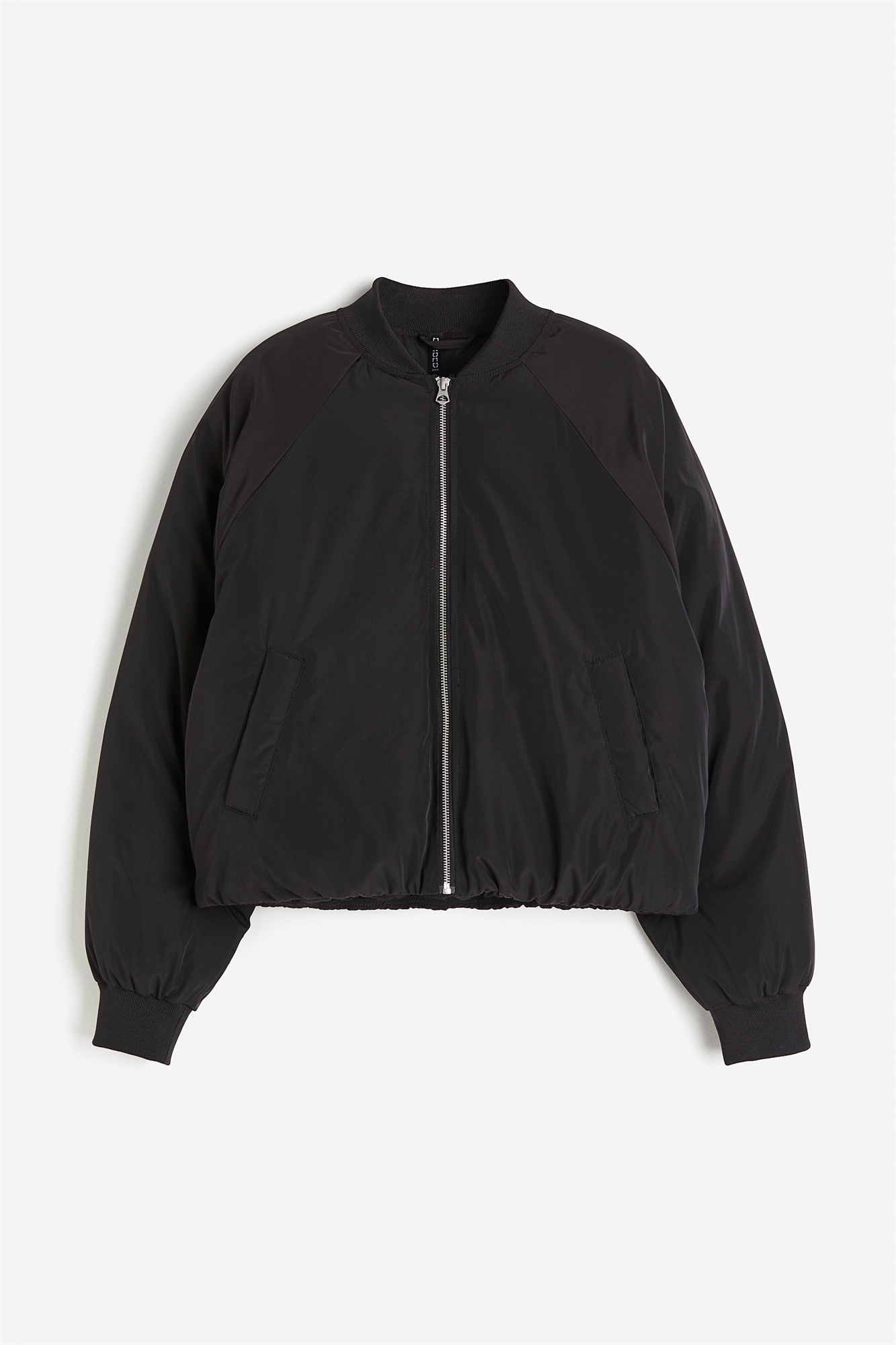 Короткая куртка-бомбер с мягкой подкладкой из тканого материала. Свободный крой с небольшим ребристым воротником, застежка-молния спереди и длинные рукава реглан. Ребристые манжеты, втачные карманы и эластичный подол. На подкладке.