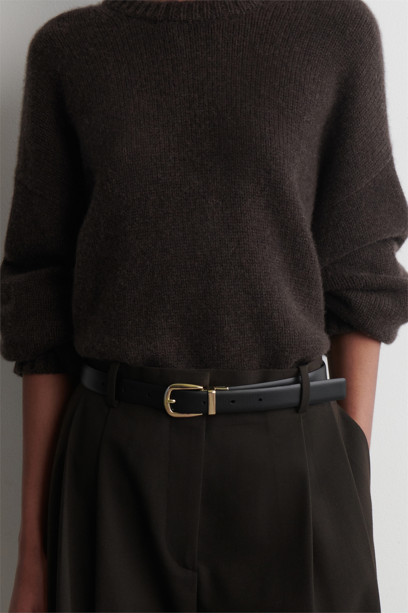Этот универсальный ремень изготовлен нашими мастерами в Италии из эластичной кожи без хрома. Его можно носить двумя способами благодаря двусторонней пряжке с золотым отливом - выбирайте между экрю и классическим черным в зависимости от вашего наряда. Застежка на пряжке COS поддерживает ответственное производство через Leather Working Group Материал: 100% кожа. Без учета отделки Общая длина размера XS/S составляет 77 см, а M/L - 95 см.