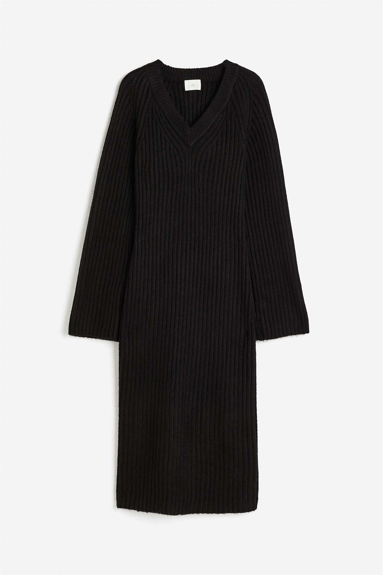 Приталенное платье длиной до колен из мягкого трикотажа в рубчик с V-образным вырезом, длинными рукавами реглан и прямым подолом.