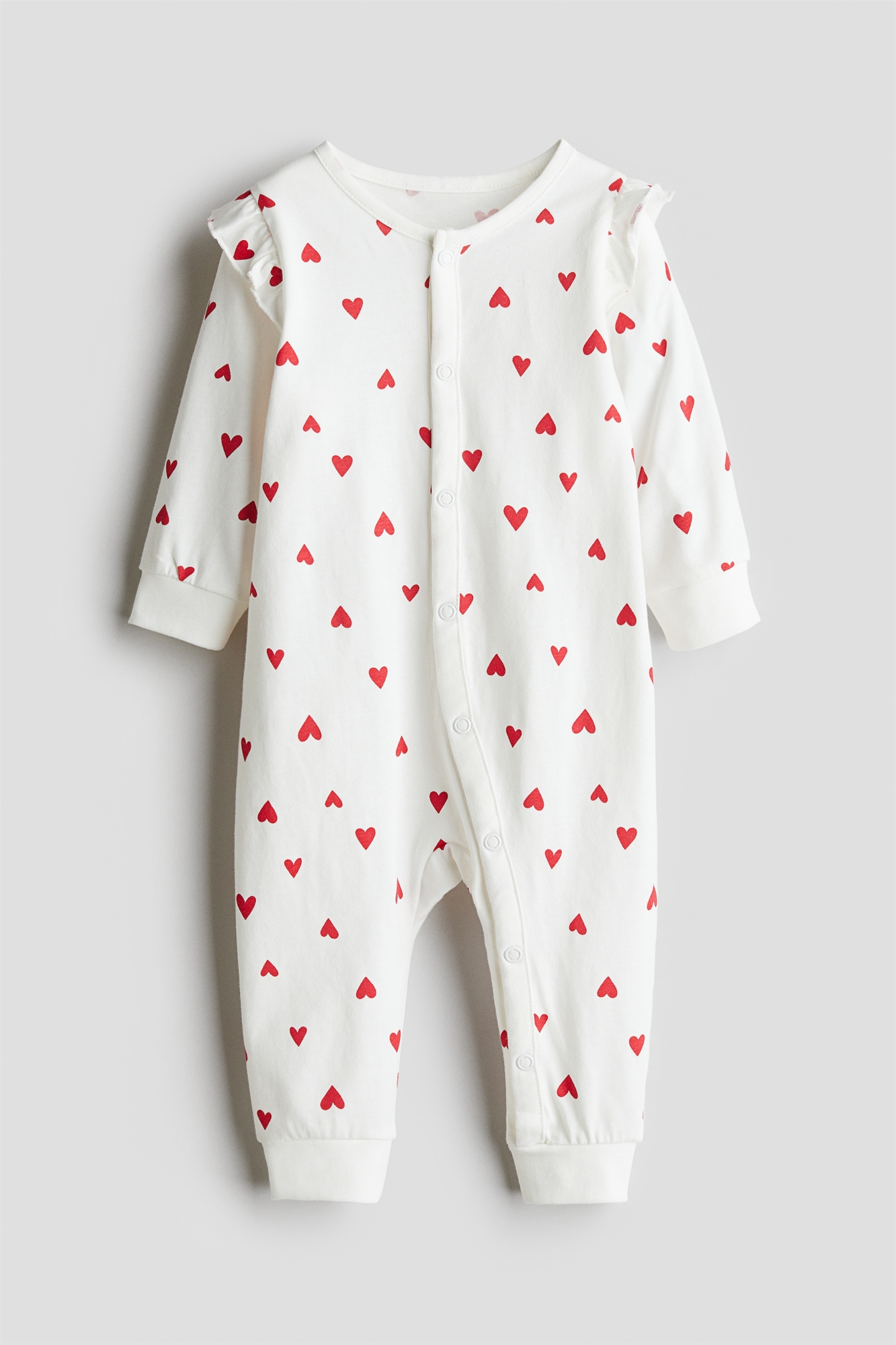 Спальный костюм из супермягкого хлопкового джерси с принтом на всю длину. Длинные рукава с отделкой на манжетах и длинные ножки с манжетами на подоле. Застежки на кнопках спереди и на одной штанине для удобства переодевания.