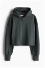 Короткая спортивная толстовка на молнии из толстовочной ткани с мягким начесом внутри. Свободный крой с капюшоном, застежка-молния спереди с защитой подбородка от натирания и длинные рукава реглан. Манжеты и подол в рубчик.