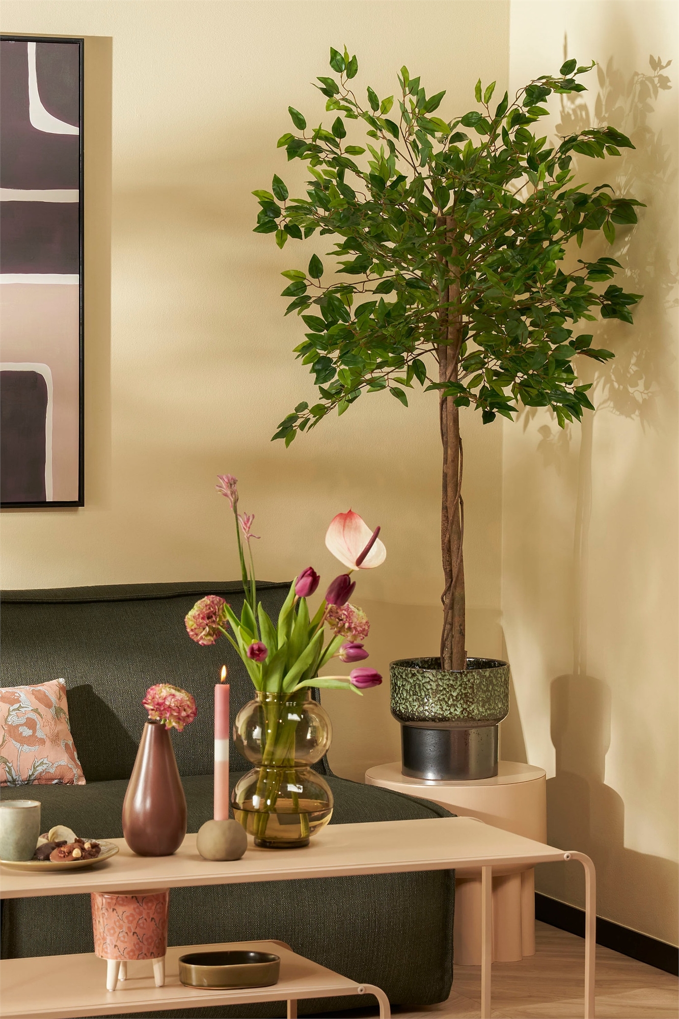 Это красивое искусственное растение фикуса от Mica Decorations высотой не менее 150 см и диаметром около 50 см. Плетеные стебли и крепкие зеленые листья практически неотличимы от настоящего растения. Боковые ветви и игриво вставленные маленькие листья сгруппированы в верхней части куста, что делает его похожим скорее на небольшое дерево, чем на кустарник. Благодаря своей длине он обеспечивает озеленение на высоте без необходимости подвешивать растения. За растением очень легко ухаживать, оно поставляется в пластиковом горшке высотой 17 см и диаметром 12 см.