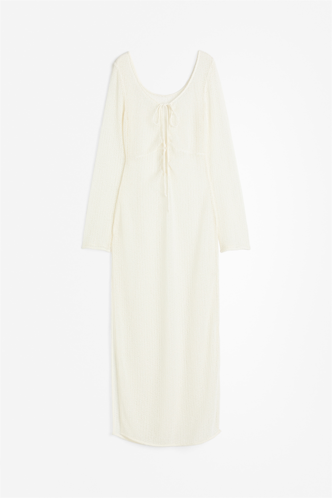 Длинное приталенное пляжное платье из плотного трикотажа с глубоким круглым вырезом и открытыми разрезами спереди с завязывающимся сзади на шее шнурком. Длинные рукава и прямой подол с высоким разрезом с одной стороны. Без подкладки.