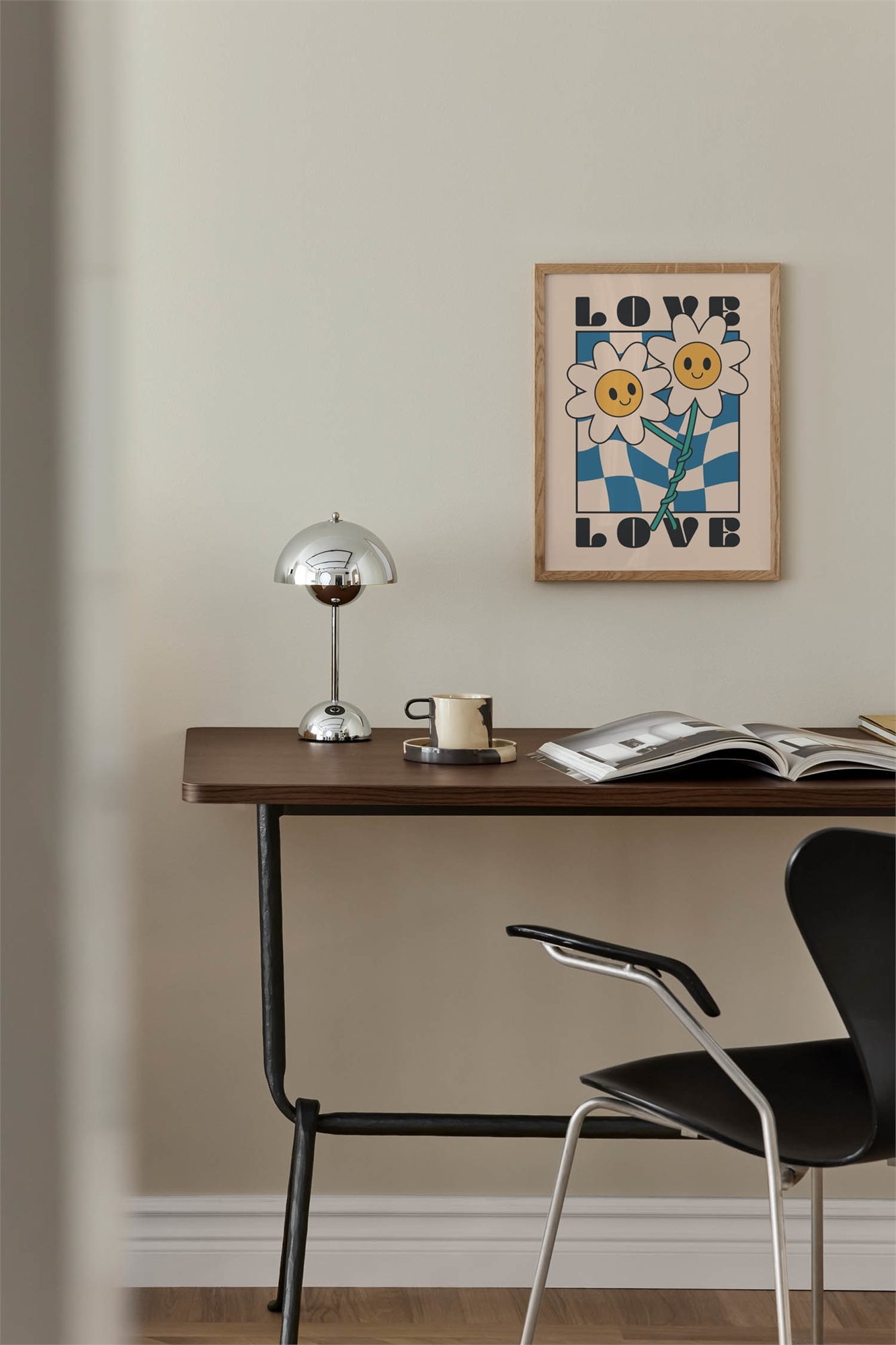 Все, что вам нужно, - это любовь! Графический милый постер в стиле ретро с изображением двух цветов, свернувшихся вместе, на клетчатом фоне синего и бежевого цветов. Почему бы не привнести в свой дом нотку цветочной энергии?