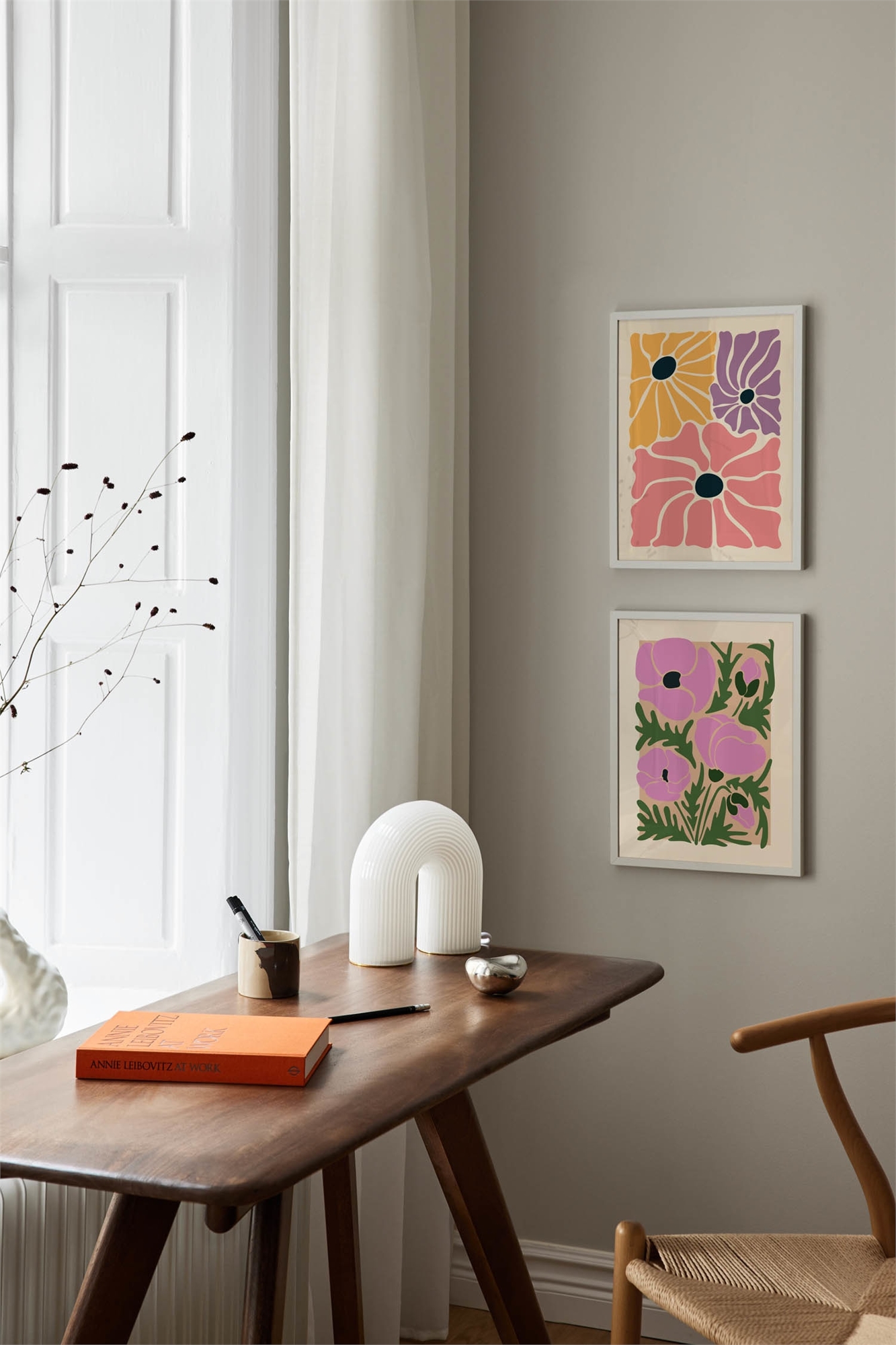 Фиолетовые маки с зелеными лепестками на бежевом фоне. Постер Purple Poppies имеет встроенную бежевую рамку, которая элегантно обрамляет мотив.