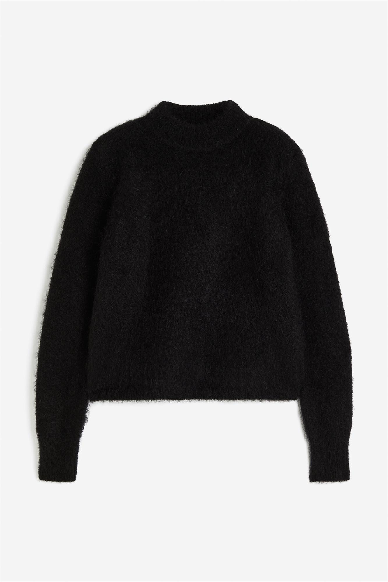 Джемпер из мягкого, пушистого трикотажа с содержанием мохера и шерсти с круглым вырезом и длинными рукавами. Окантовка по вырезу, манжетам и подолу.