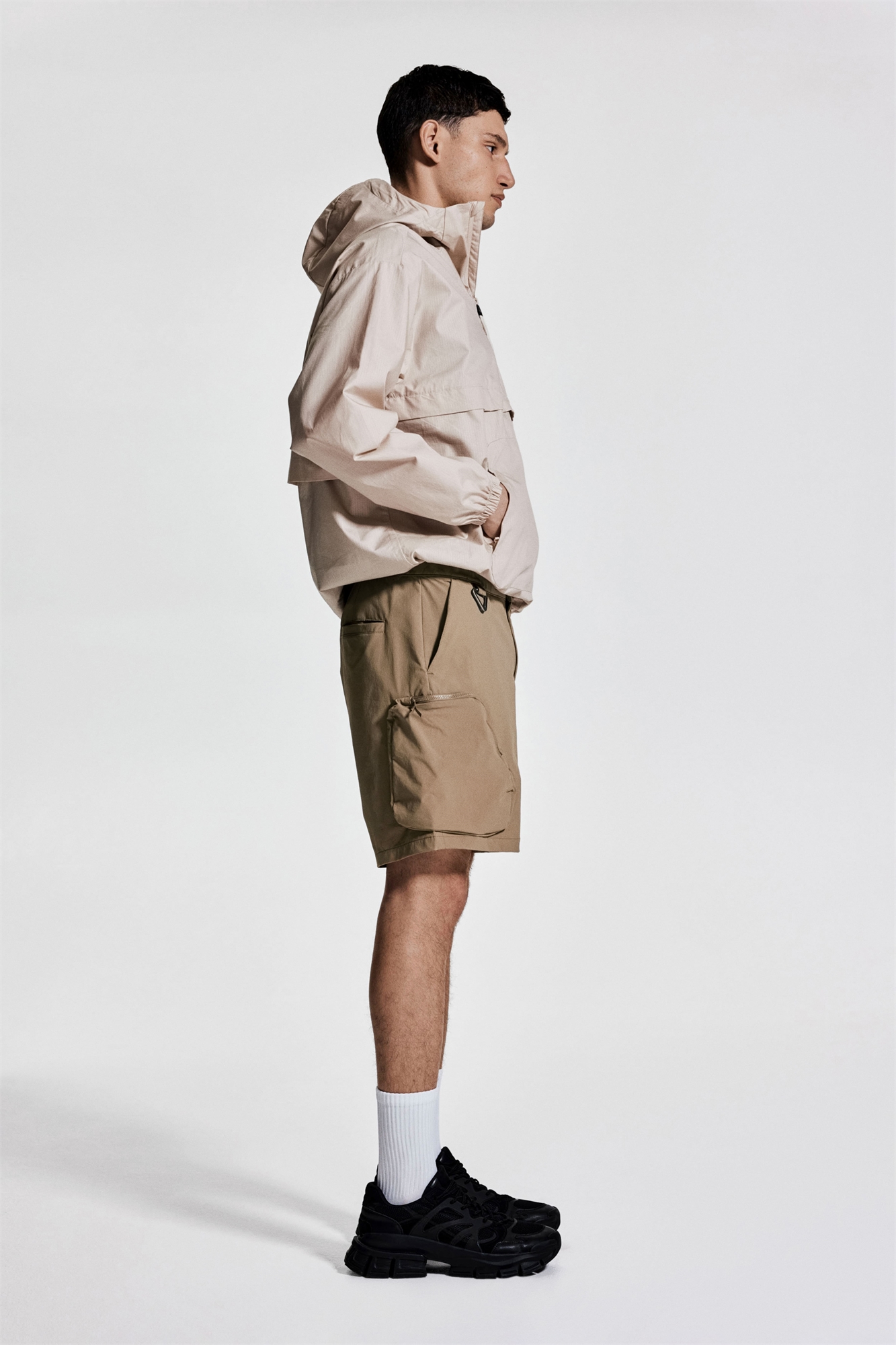 Шорты средней длины из дышащей, ветронепроницаемой и водоотталкивающей функциональной ткани, предназначенной для защиты от дождя и ветра. Расслабленный крой с высокой талией с утяжкой, регулируемым поясом с пластиковой пряжкой, крючком-карабином и ширинкой на молнии с потайной кнопкой. Диагональные карманы спереди, накладной карман сзади и большие накладные карманы на молнии по бокам, в одном из которых есть внутренний карман для мобильного.
