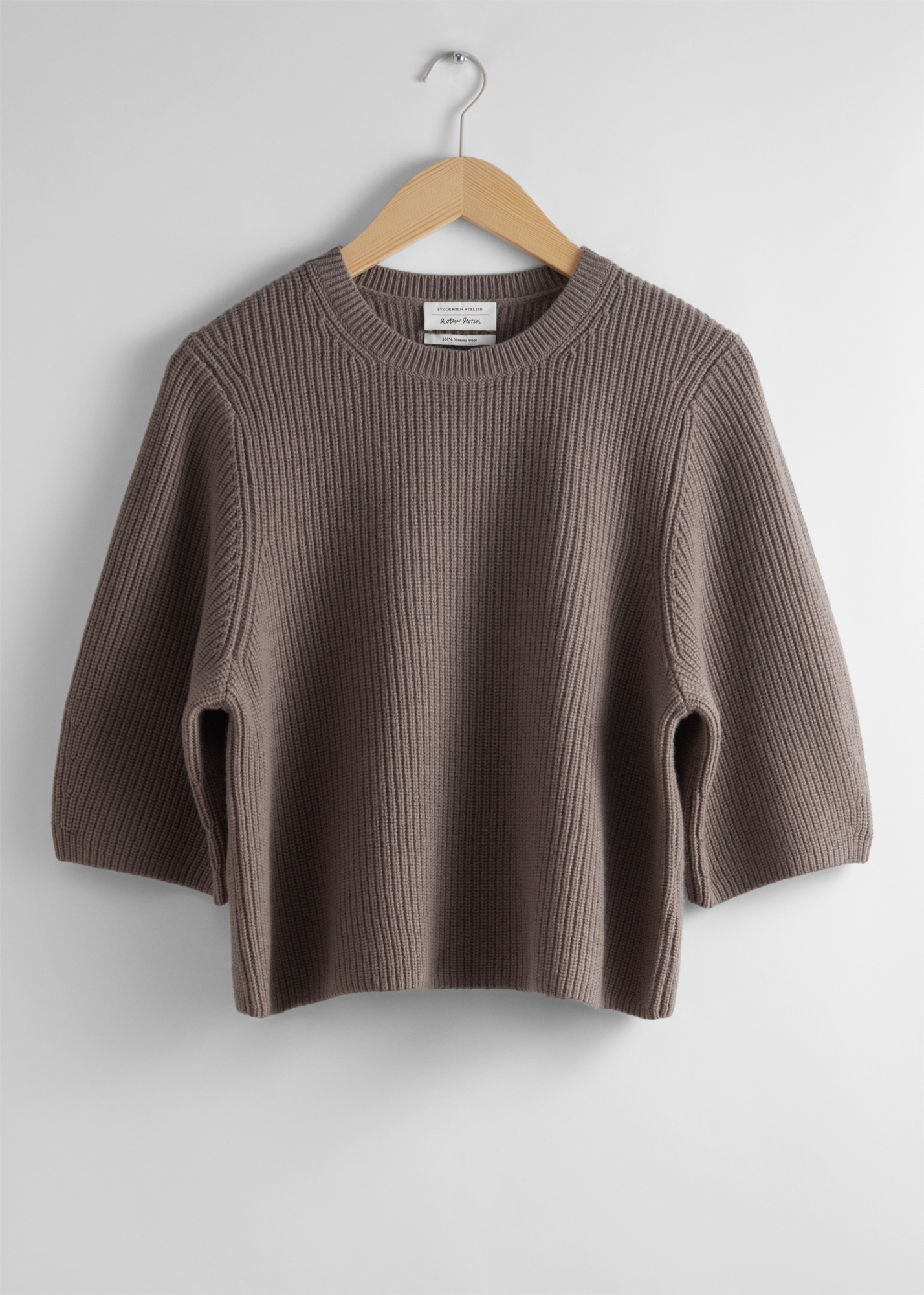 Топ из мериносовой шерсти с ребристой отделкой и рукавами три четверти. • Свободный силуэт • Круглый ребристый вырез • Сертифицирован в соответствии со стандартом ответственной шерсти (CU893290) Длина топа: 52 см / 20,5" (размер S)