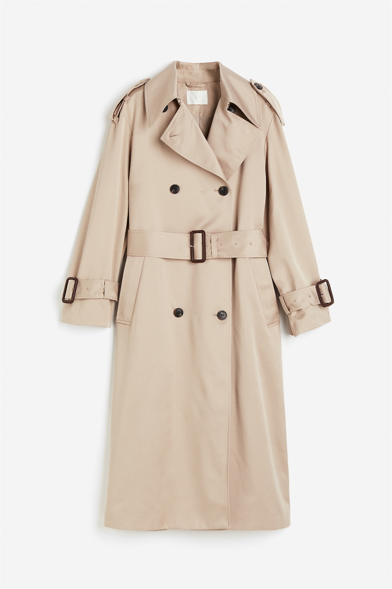 Двубортный тренч длиной до щиколоток из саржи с воротником, лацканами и металлической застежкой-крючком в верхней части. Свободный крой с пуговицами спереди и широким съемным поясом на талии с пряжкой. Декоративные плечевые накладки на пуговицах и регулируемая застежка с пряжкой на манжетах. Прорезные боковые карманы, штормовой клапан сзади и один задний клапан. На подкладке.
