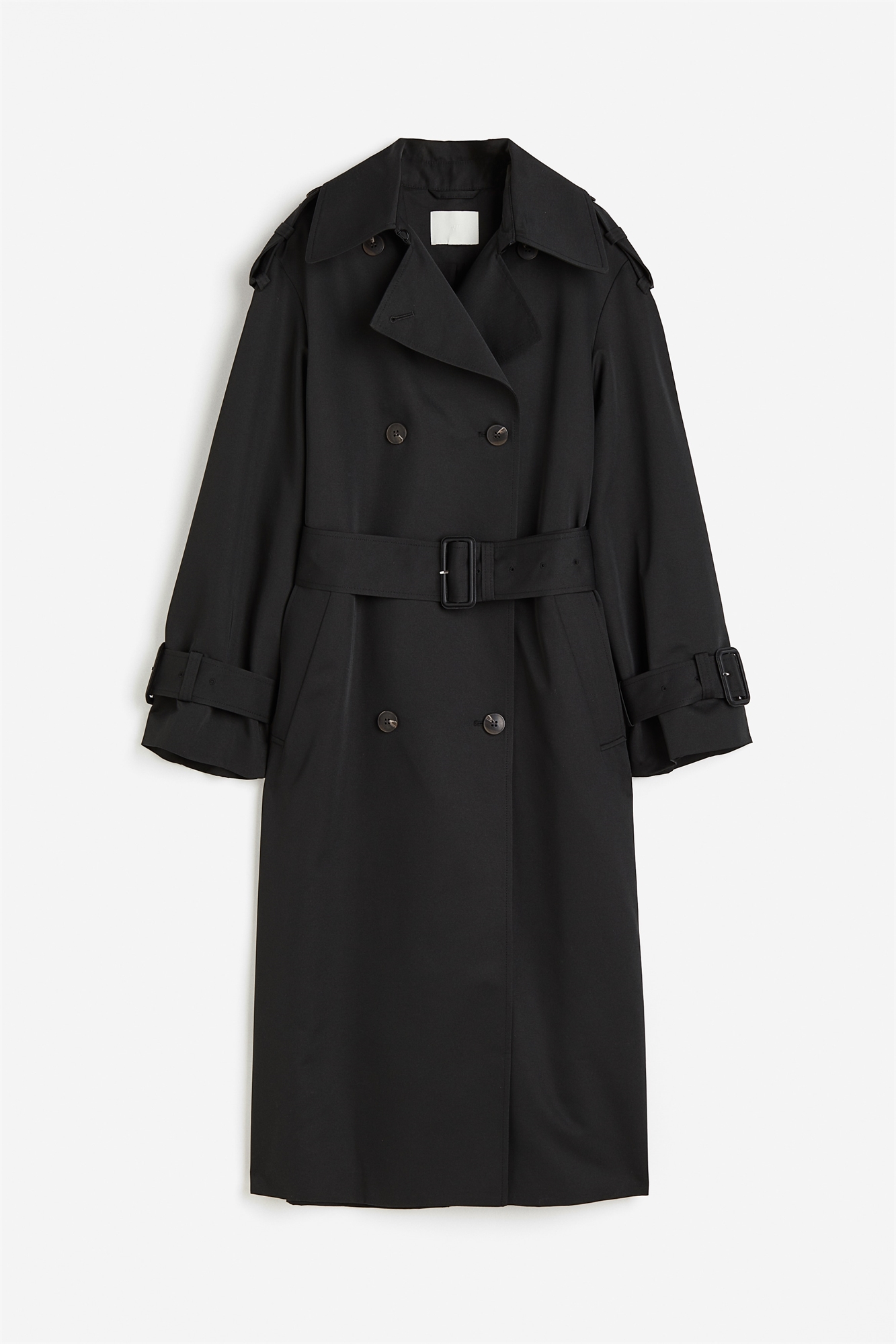 Двубортный тренч длиной до щиколоток из саржи с воротником, лацканами и металлической застежкой-крючком в верхней части. Свободный крой с пуговицами спереди и широким съемным поясом на талии с пряжкой. Декоративные плечевые накладки на пуговицах и регулируемая застежка с пряжкой на манжетах. Прорезные боковые карманы, штормовой клапан сзади и один задний клапан. На подкладке.