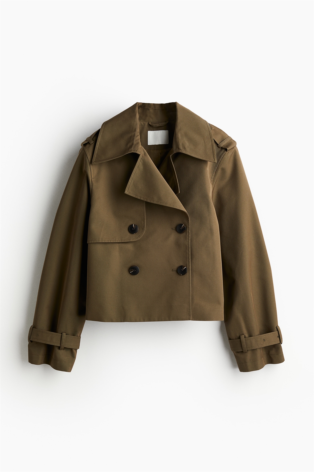 Короткий двубортный пиджак из саржи с лацканами с вырезом, штормовым клапаном и пуговицами спереди. Свободный крой с завязкой и пуговицей на плечах и длинные рукава с регулируемой завязкой и застежкой на манжетах. На подкладке.