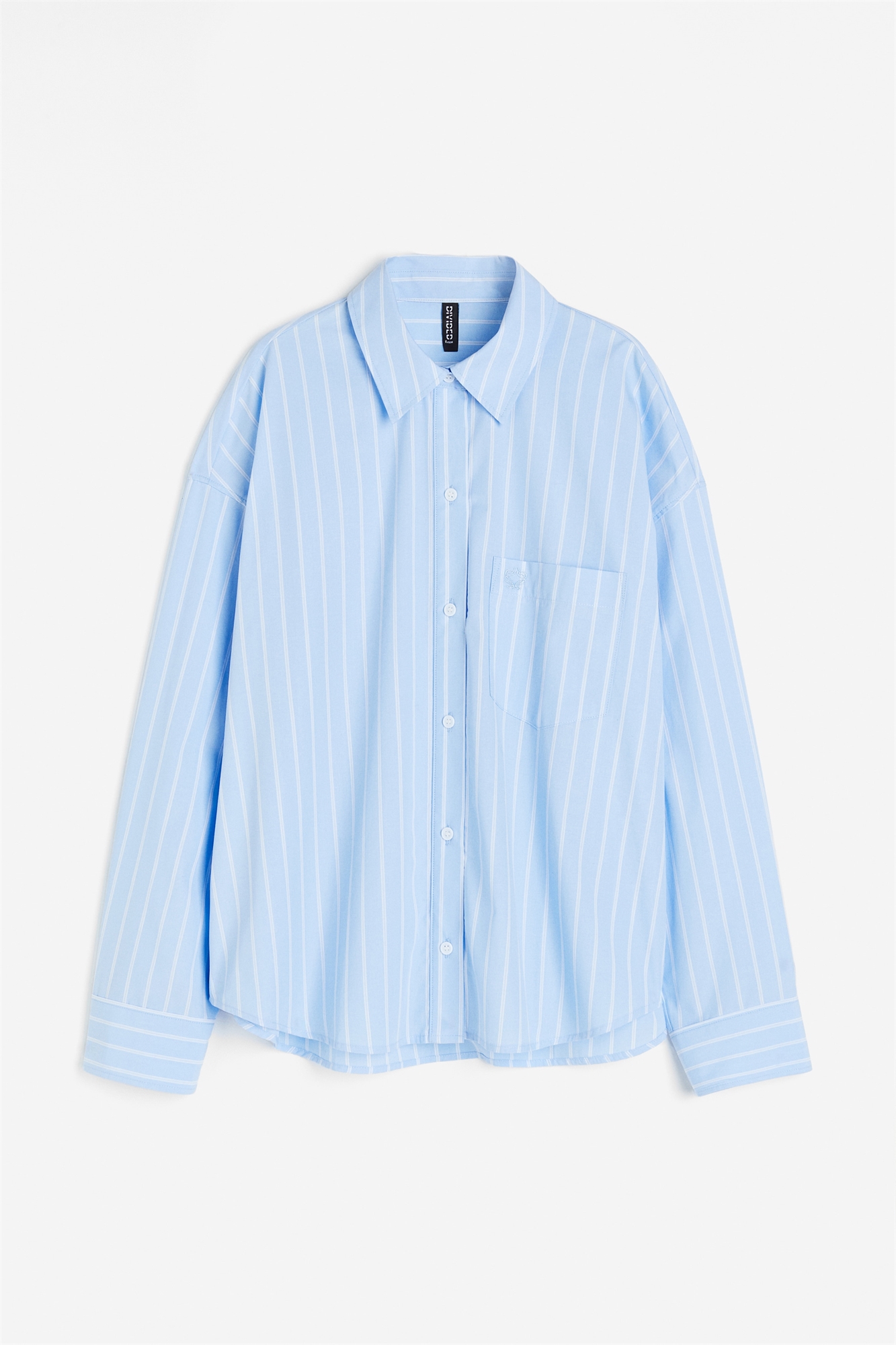 Рубашка оверсайз из мягкого хлопкового полотна с накладным нагрудным карманом с вышитым мотивом. Воротник, застежка на пуговицы спереди и ярмо со складками сзади. Спущенные плечи, длинные рукава с манжетами на пуговицах и слегка закругленный подол. Немного длиннее сзади.