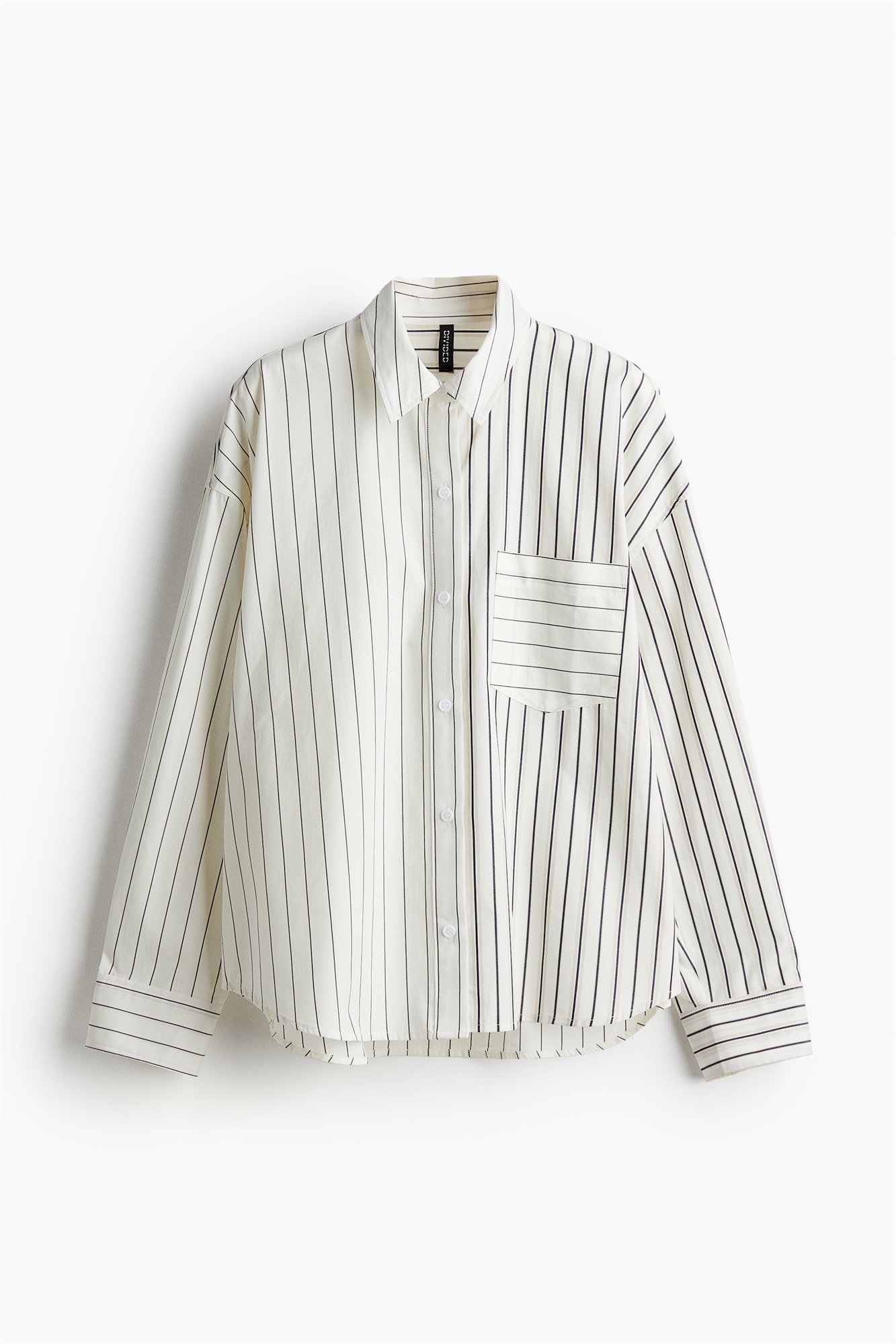 Рубашка оверсайз из мягкого хлопкового полотна с накладным нагрудным карманом с вышитым мотивом. Воротник, застежка на пуговицы спереди и ярмо со складками сзади. Спущенные плечи, длинные рукава с манжетами на пуговицах и слегка закругленный подол. Немного длиннее сзади.