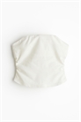 Короткий корсетный топ-бандо со сборками по боковым швам, создающими эффект легкой драпировки. Скрытая застежка-молния и застежка-крючок сзади. Без подкладки.