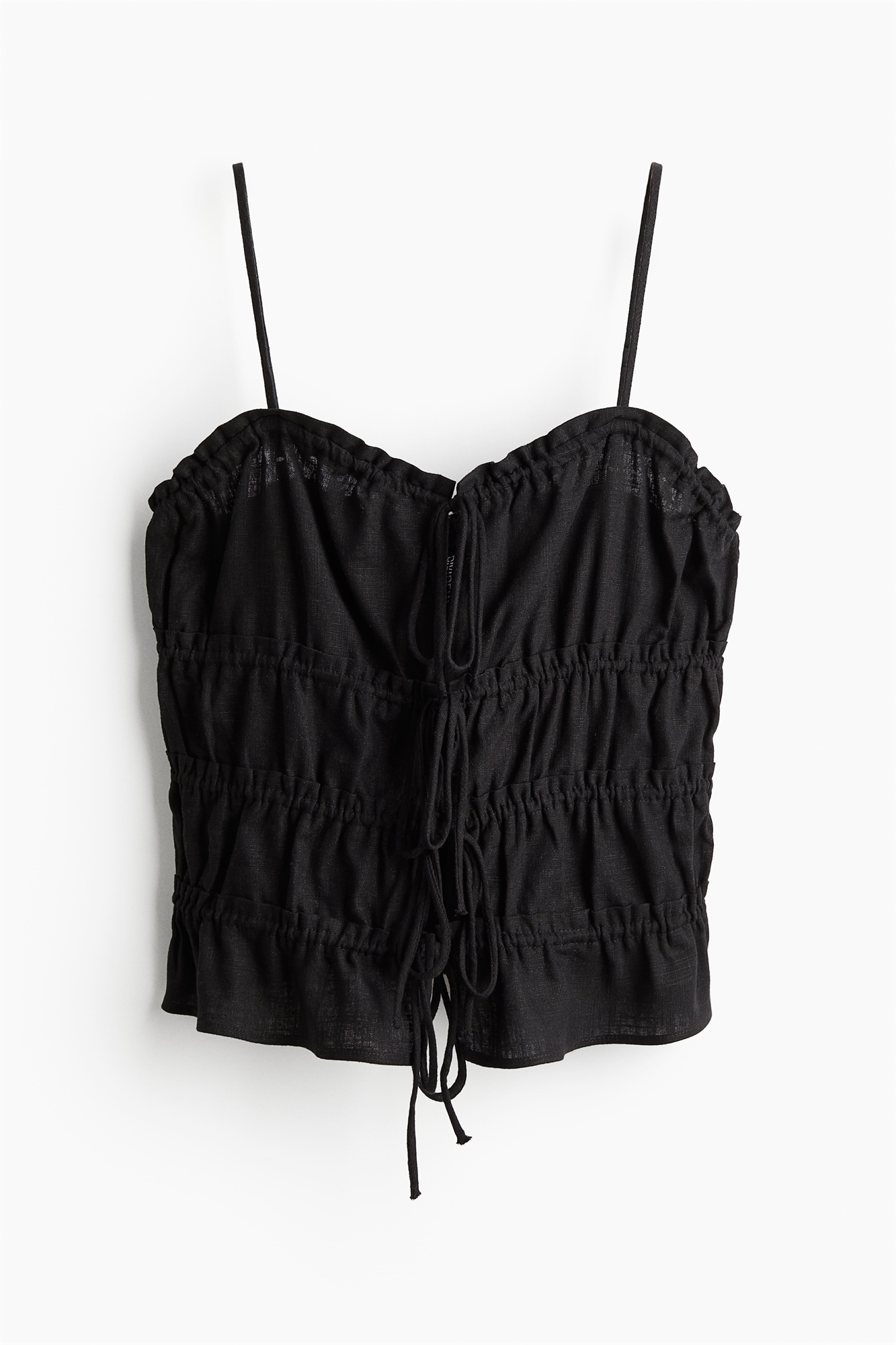 Топ из смеси льна и вискозы с воздушным плетением и множеством завязок с оборками, создающих эффект легкой драпировки. Вырез в форме сердца, открытая передняя часть и узкие регулируемые бретели.
