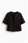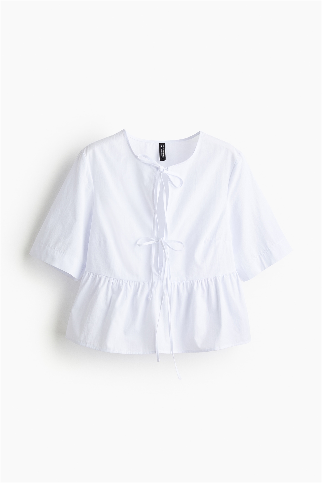 Блузка из хрустящего хлопкового поплина с круглым вырезом и проймой с двумя завязками спереди. Короткие рукава, заканчивающиеся чуть выше локтей, сборчатый шов на талии и прямой подол.