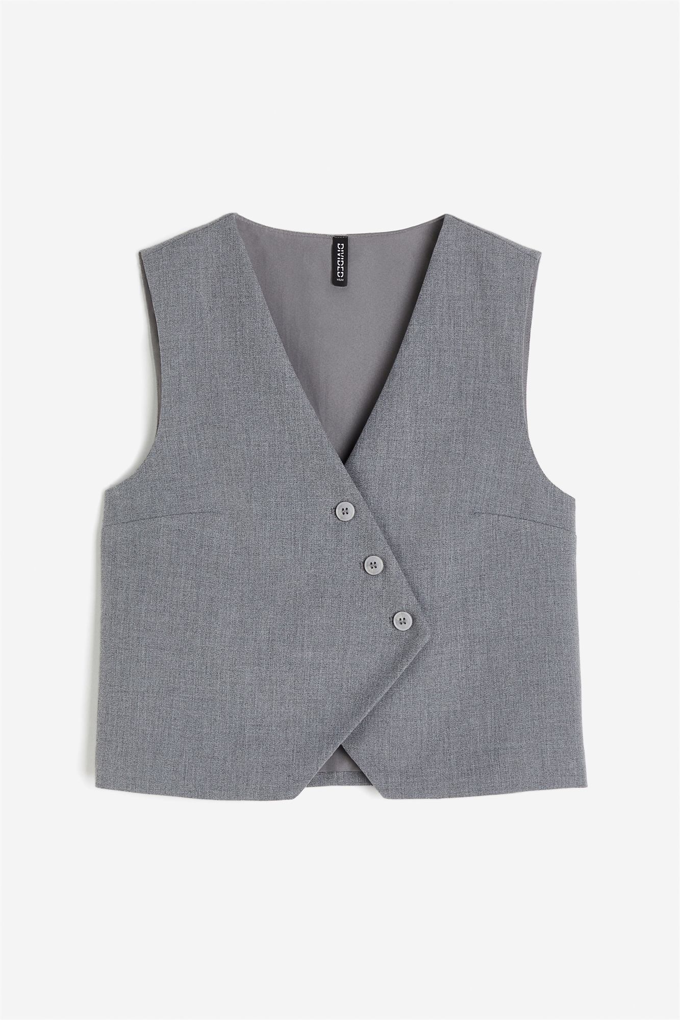 Жилет из тканого материала с V-образным вырезом горловины и асимметричным передом с диагонально расположенными пуговицами и потайной пуговицей с одной стороны. На подкладке.