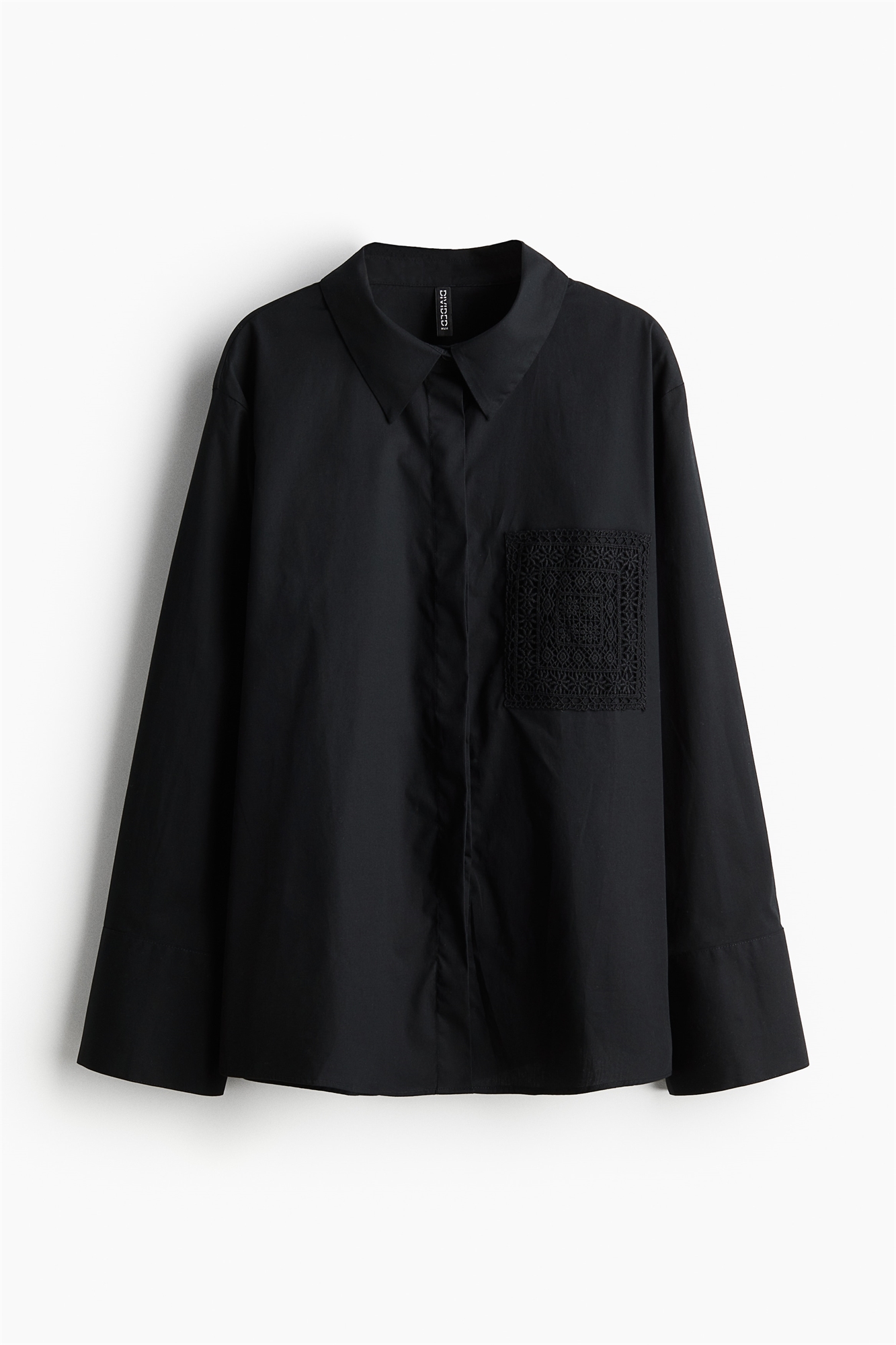 Рубашка из хрустящего хлопкового поплина с воротником, потайными пуговицами спереди и накладным карманом на груди. Свободный крой с опущенными плечами и длинными рукавами с широкими манжетами на пуговицах. Застежка с узкими завязками сзади. Аккуратный закругленный подол.