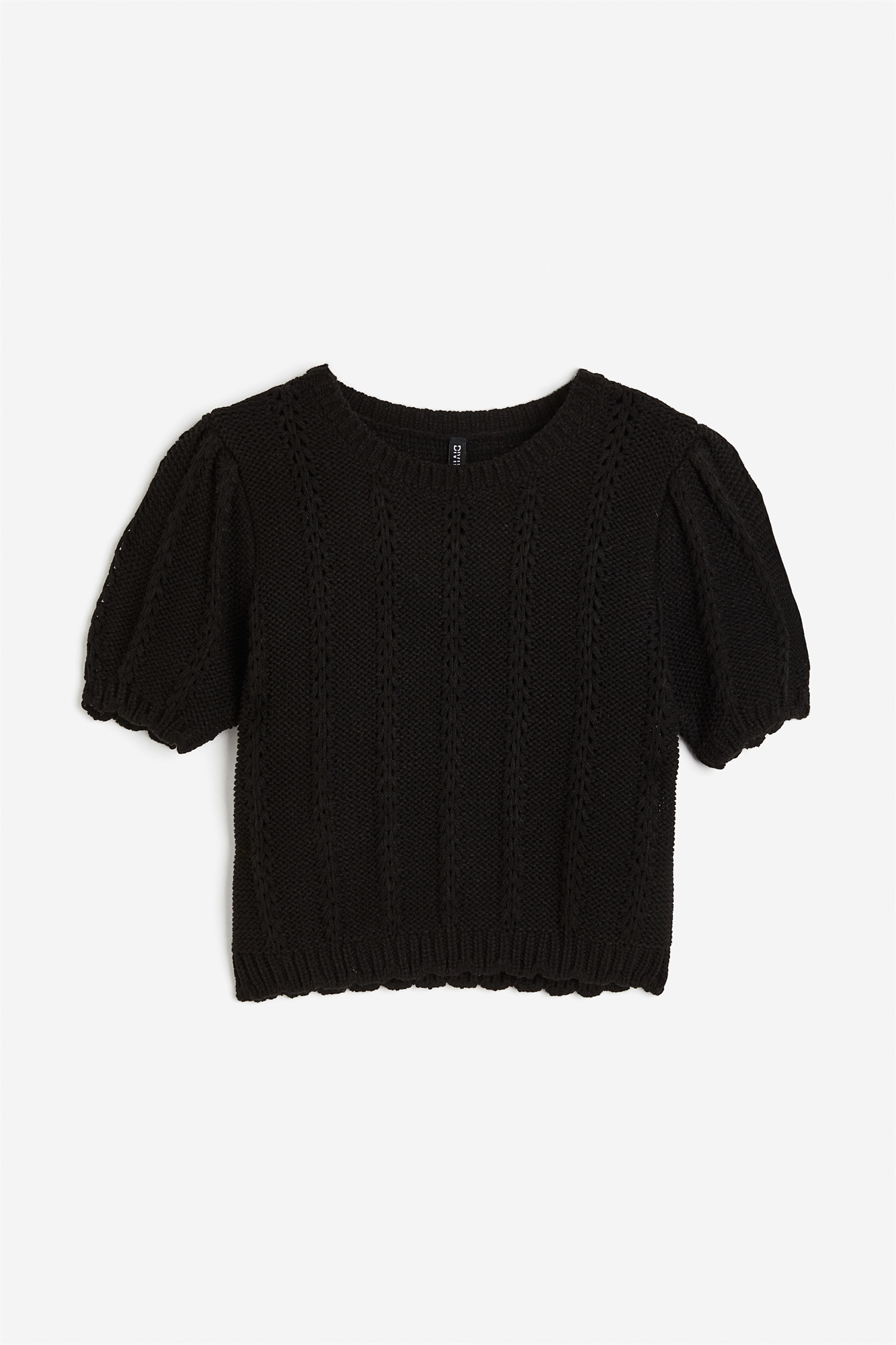 Короткий топ из фактурного трикотажа. Круглый вырез с ребристой отделкой, короткие пышные рукава, манжеты и подол с ребристой отделкой в виде гребешков.