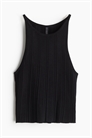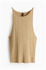 Короткий приталенный жилет из тонкой вискозной ткани с ребристой вязкой, с круглым вырезом, узким разрезом в верхней части и узкими бретелями.