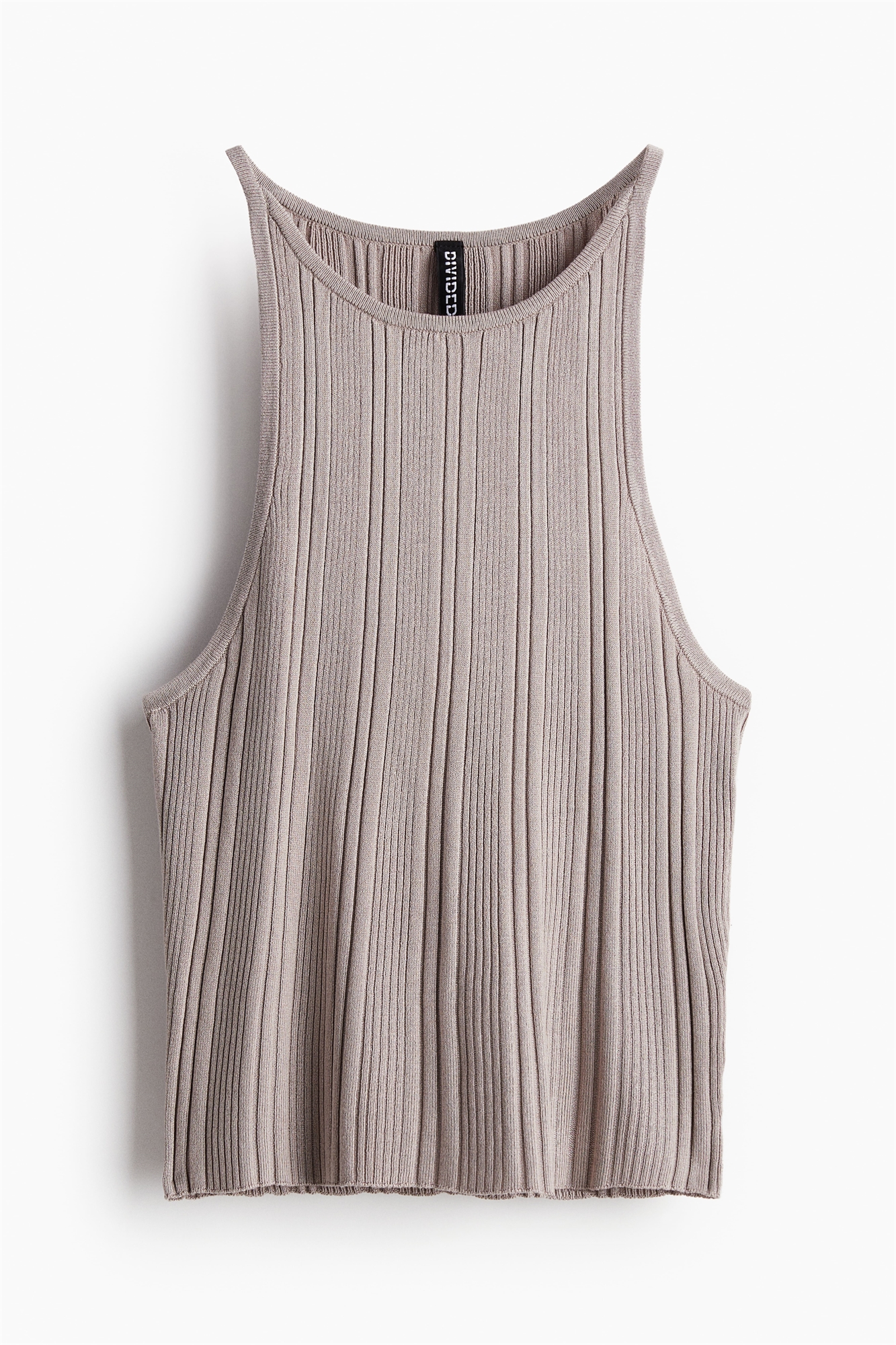 Короткий приталенный жилет из тонкой вискозной ткани с ребристой вязкой, с круглым вырезом, узким разрезом в верхней части и узкими бретелями.