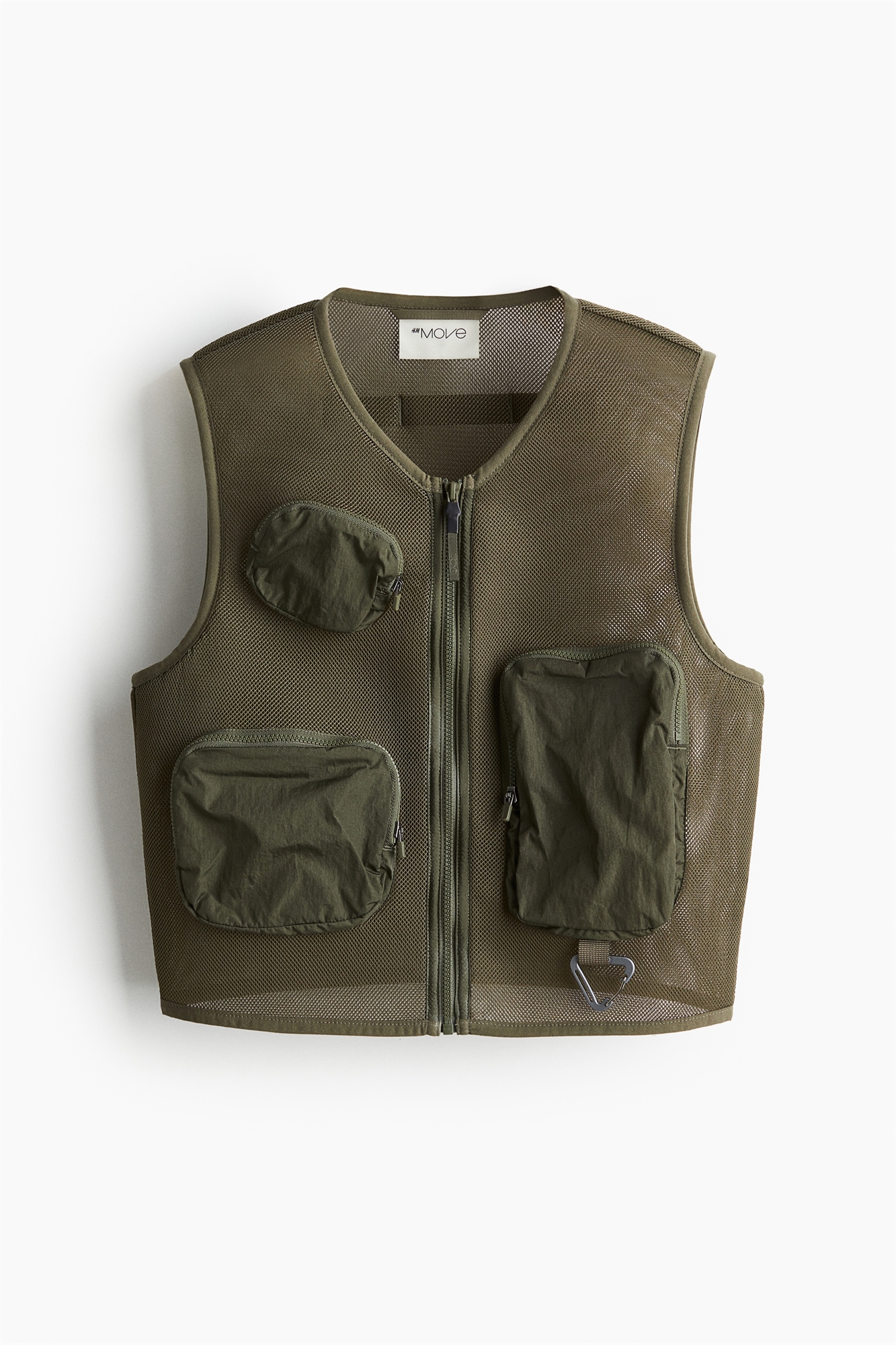 Обрезанная утилитарная жилетка из сетки с внешними карманами на молнии из нейлона, один из которых с металлическим крючком-карабином. Регулярный крой с круглым вырезом и застежкой-молнией спереди.