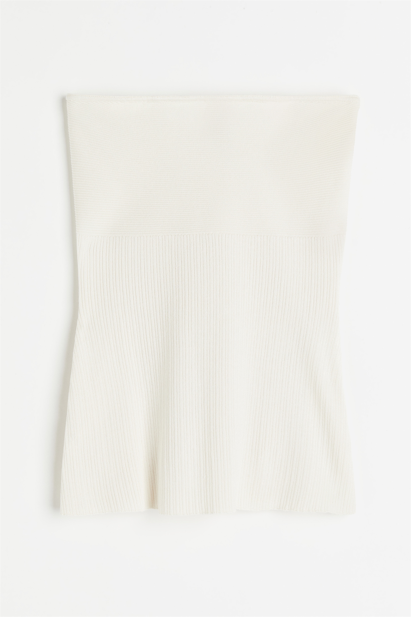 Слегка удлиненный, слегка расклешенный топ из тонкого трикотажа в рубчик со скрытой силиконовой лентой в верхней части и боковым разрезом на подоле.