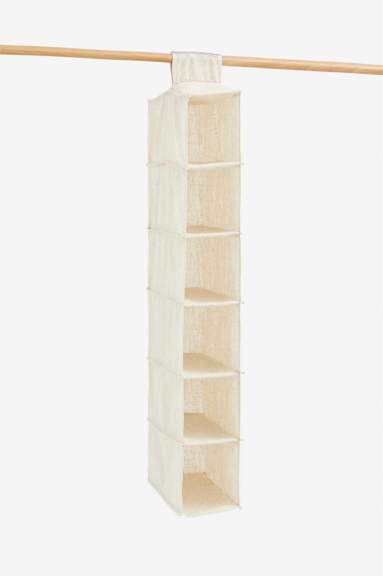 Разгрузите свое пространство и создайте гармоничную элегантность одним движением с помощью этой подвесной системы хранения из льняной смеси с шестью отделениями. Идеально подходит для спален, шкафов и даже детских комнат, это универсальное решение для хранения позволит сохранить ваши вещи аккуратно организованными и легко доступными. Крючки и петли в верхней части позволяют легко вешать и перемещать его при необходимости. Ширина 16 см. Глубина 34 см. Высота 96 см.